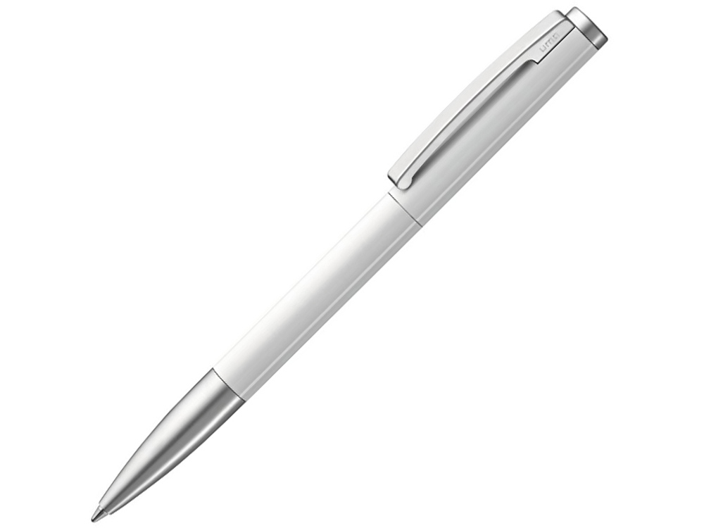 Металлическая шариковая ручка с поворотным механизмом и пружинным клипом. Поверхность серебристого матового цвета, фурнитура глянцевая, черная матовая или белая глянцевая с матовыми деталями.