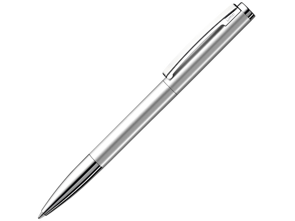 Металлическая шариковая ручка с поворотным механизмом и пружинным клипом. Поверхность серебристого матового цвета, фурнитура глянцевая, черная матовая или белая глянцевая с матовыми деталями.