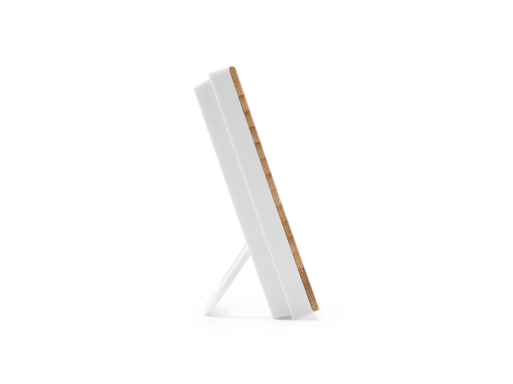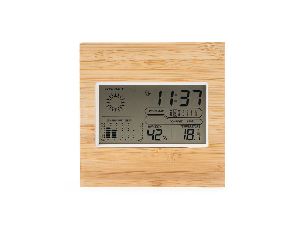 Метеостанция с лицевой стороной из бамбука. Часы, календарь и функция будильника с датчиками температуры и влажности. Запись максимальной и минимальной температуры и влажности. Работает от 2 батареек типа ААА (не входят в комплект).