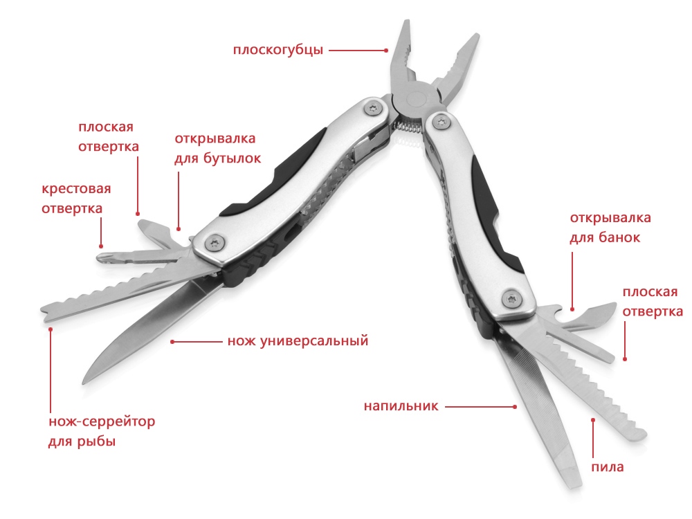 Настоящая находка для всех хозяйственных мужчин. Мультиинструмент всегда будет под рукой, так как его можно носить на поясе. Супер-пассатижи в чехле не так просты, как кажутся на первый взгляд! Они скрывают в себе целый арсенал нужных инструментов! - плоскогубцы - открывалка для бутылок - крестовая отвертка - нож-серрейтор для рыбы - нож универсальный - открывалка для банок - плоская отвертка 2 шт - пила - напильник