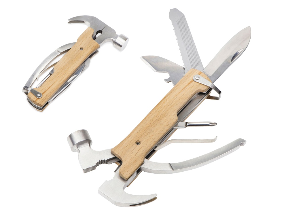 Многофункциональный инструмент, который выручит дома, на даче, в путешествии, походе и во множестве других ситуаций. Полностью сделан из металла и декорирован накладками из натурального дерева. Чехол в комплекте. Основные функции: - Молоток - Плоскогубцы - Гвозодер - Кусачки - Пила - Напильник - Нож - Открывашка - Отвертка (крестовая и плоская)