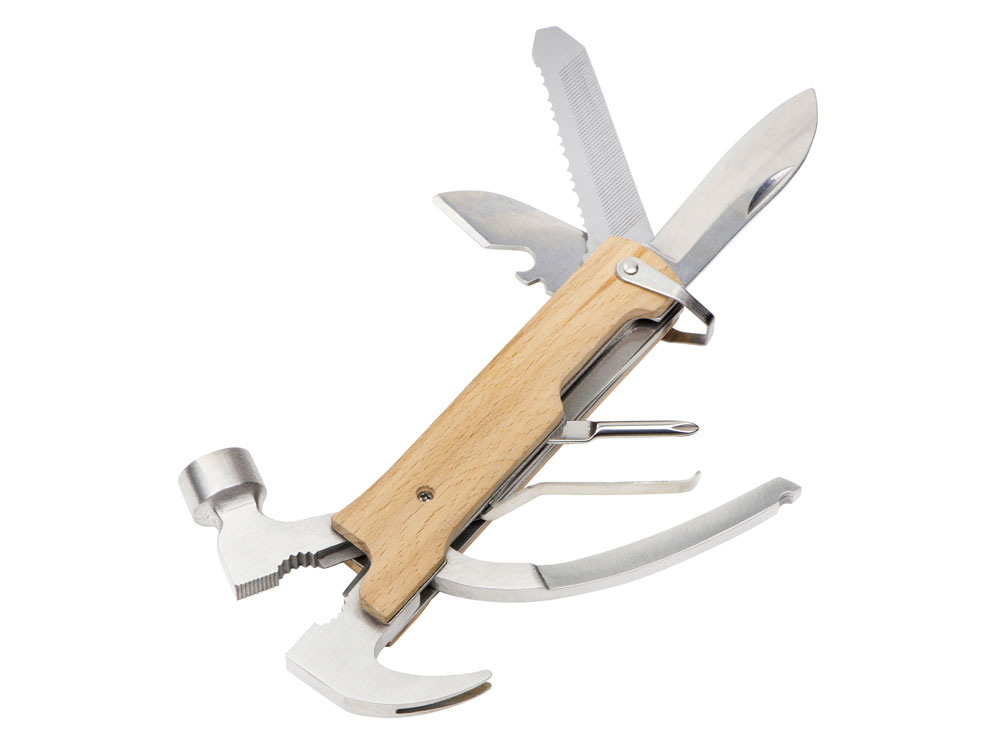 Многофункциональный инструмент, который выручит дома, на даче, в путешествии, походе и во множестве других ситуаций. Полностью сделан из металла и декорирован накладками из натурального дерева. Чехол в комплекте. Основные функции: - Молоток - Плоскогубцы - Гвозодер - Кусачки - Пила - Напильник - Нож - Открывашка - Отвертка (крестовая и плоская)