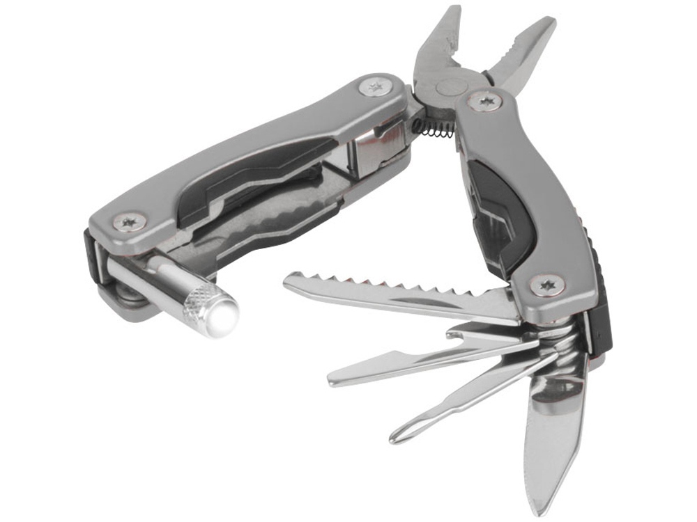 Мультиинструмент с диодным фонариком. В комплекте нейлоновый чехол с петелькой для крепления и застежкой на липучке. Батарейки в комплекте. - плоскогубцы - фонарик - пила - нож универсальный - плоская отвертка - крестовая отвертка - открывашка для банок/бутылок