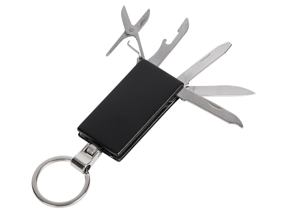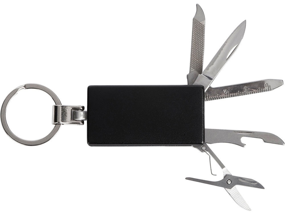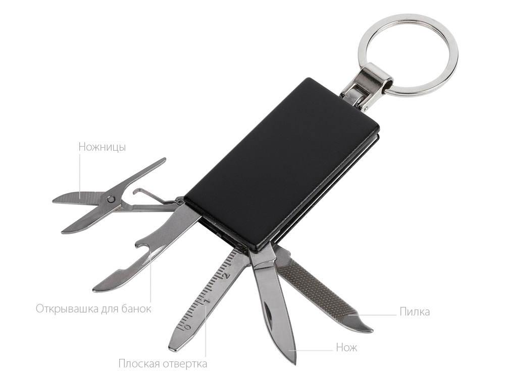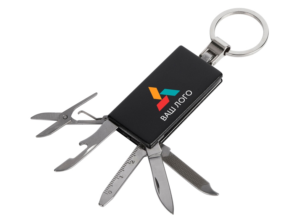 Брелок-мультитул на кольце в металлическом корпусе с заметным полем под нанесение. В комплекте нож, ножницы, пилка, плоская отвертка, открывашка для банок. - 4 самых нужных инструмента всегда под рукой - металлический корпус обеспечивает прочность, а значит, и долгую жизнь