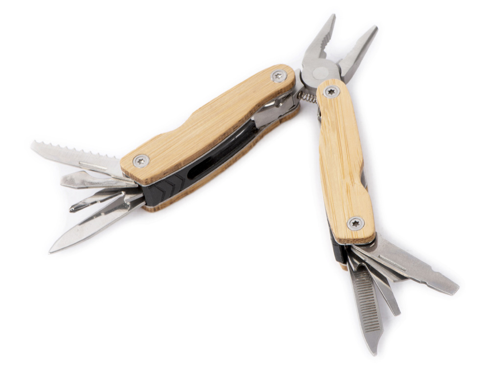 Компактный мультитул на каждый день с корпусом из бамбука. Поставляется в коробочке с чехлом. - плоскогубцы - открывалка для бутылок - крестовая отвертка - нож универсальный - открывалка для банок - плоская отвертка 3 шт. - пила по дереву - напильники по дереву и металлу