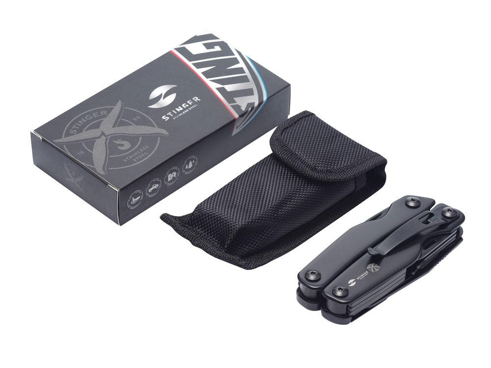 Мультитул Stinger, 100x40 мм, 11 функций, сталь, чёрный, в комплекте нейлоновый чехол купить оптом и в розницу с нанесением логотипа в Нижнем Новгороде