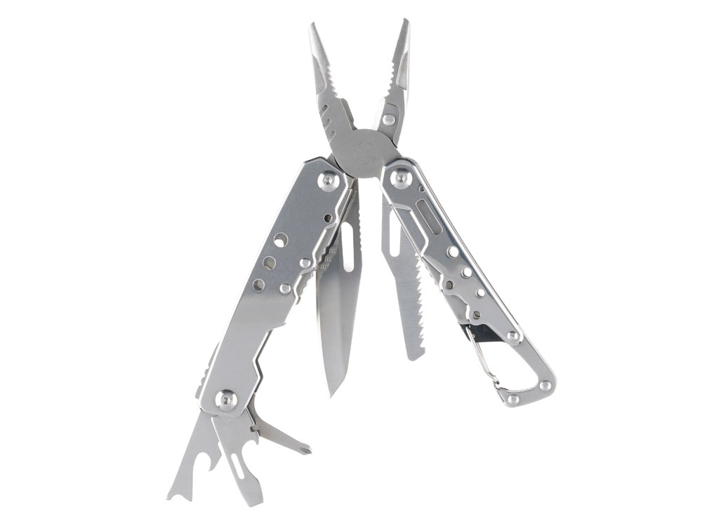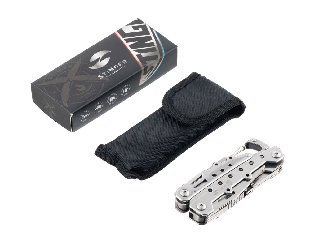МНОГОФУНКЦИОНАЛЬНЫЙ ИНСТРУМЕНТ STINGER С НАБОРОМ ИЗ 12 ФУНКЦИЙ: 1. Острогубцы   2. Пассатижи 3. Кусачки 4. Лезвие большое плоское 5. Пила по дереву 6. Отвёртка крестовая 7. Отвёртка шлицевая большая 8. Инструмент для снятия изоляции 9. Стропорез 10. Открывалка для бутылок 11. Консервный нож 12. Карабин ХАРАКТЕРИСТИКИ: Материал инструментов: нержавеющая сталь 3Cr13 Материал рукояти: нержавеющая сталь Длина: 105 мм Ширина: 40 мм Вес: 261 г В комплекте: чехол из синтетического материала Упаковка: картонная коробка