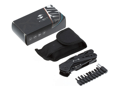 Мультитул Stinger, 105x45 мм, 13 функций, сталь, чёрный, в комплекте 9 насадок и нейлоновый чехол купить оптом и в розницу с нанесением логотипа в Нижнем Новгороде