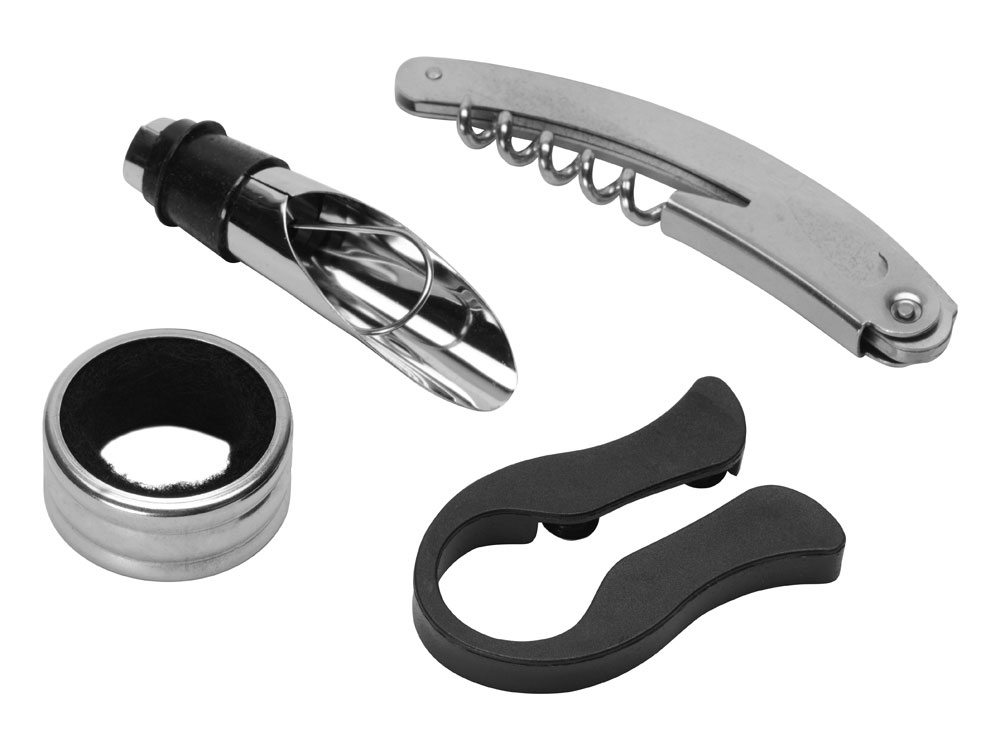 Комплектность футляр 34,8 х 11 х 11,7 см, каплеуловитель d4 х 1,9 см, аэратор 2,2 х 1,8 х 7,6 см, нож для фольги 6,7 х 4,5 х 0,9 см, штопор 11 х 2,2 х 1,1 см