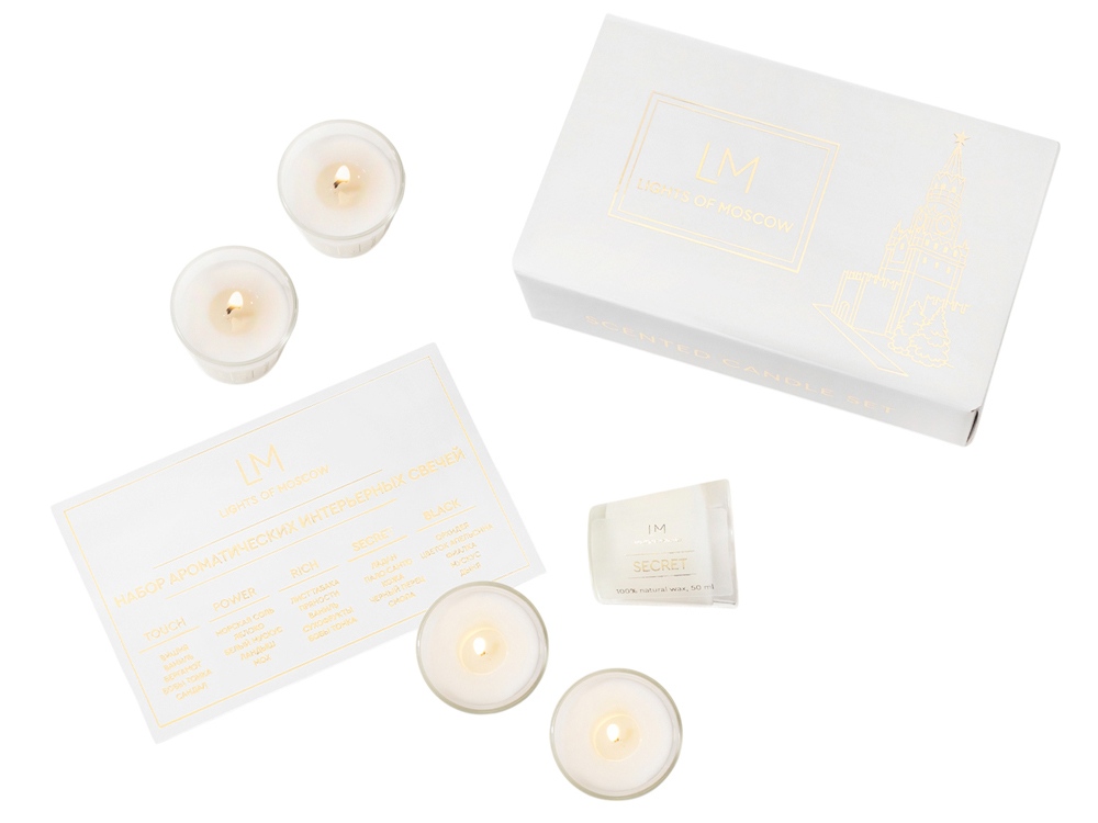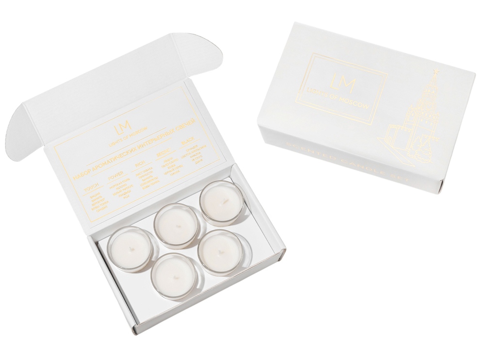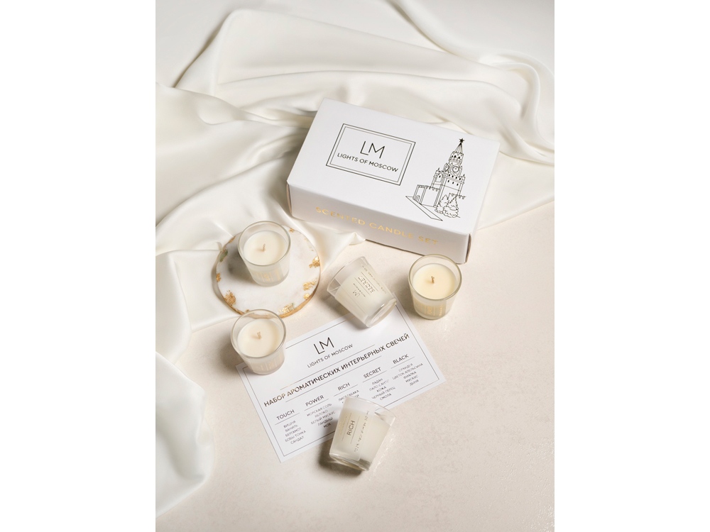 Подарочный набор ароматических свечей - это не только прекрасный, необычный подарок, но и отличный способ познакомиться брендом Lights of Moscow и его эксклюзивными ароматами. Scented candle set состоит из 5 ароматов со своей особенной историей, ассоциацией. Touch Притягательный и соблазнительный аромат во главе со спелой вишней, в которой контрастируют сладкие и терпкие, яркие и таинственные ноты. Красная и чарующая она пробуждает неутолимое желание и будоражит фантазию, завершая композицию незаметным шлейфом чувственных нот: бобами тонка, бергамота, ванили и сандалового дерева. Power Энергичная, но в то же время утонченная композиция, напоминающая морские брызги и дуновение ветра. Глубокие, акватические ноты постепенно раскрываются в тандеме с зелёным яблоком и белым мускусом. Бодрящий и свежий аромат завершается оттенками ландыша и мха, подчёркивая прохладу и романтику всей пирамиды нот. Secret Чувственная и романтическая орхидея - это цветок любви и красоты, олицетворяющий великолепие и совершенство. Женственная композиция дополнена оттенками цветка апельсина, который подчеркивает фруктовые акценты, а дополнение в качестве пленительных нот фиалки, мускуса и дыни придают особенную глубину композиции. Rich Это аромат роскоши, атмосфера светского мероприятия, проходящего в дорогом зале, где собрались леди и джентельмены. Листья табака имеют пряный и в тоже время свежий аромат, он прекрасно дружит с ванилью, усложняя композицию, делая её более дорогой и утонченной. В то время как сухофрукты и бобы тонка добавляют интригующей ноты аромату. Black Дымный и загадочный аромат с яркими нотами смолы и ладана ассоциируется с уверенностью и элегантностью. Восточно-древесная композиция дополнена восхитительным, интригующим шлейфом пало санто, кожи и чёрного перца. Комплектность: - Подарочная коробка с ложементом и брендированной лентой - 1 шт. - Свечи брендированные 5 шт.*50 мл. - Открытка - 1 шт. Условия хранения: — Свечи, аромасаше, аромадиффузоры, SPA-наборы следует хранить при температуре +18…+24 °C, вдали от источников тепла, сквозняков и прямых солнечных лучей. — Рекомендуемая влажность — не более 50%. — Избегайте длительного воздействия яркого света.