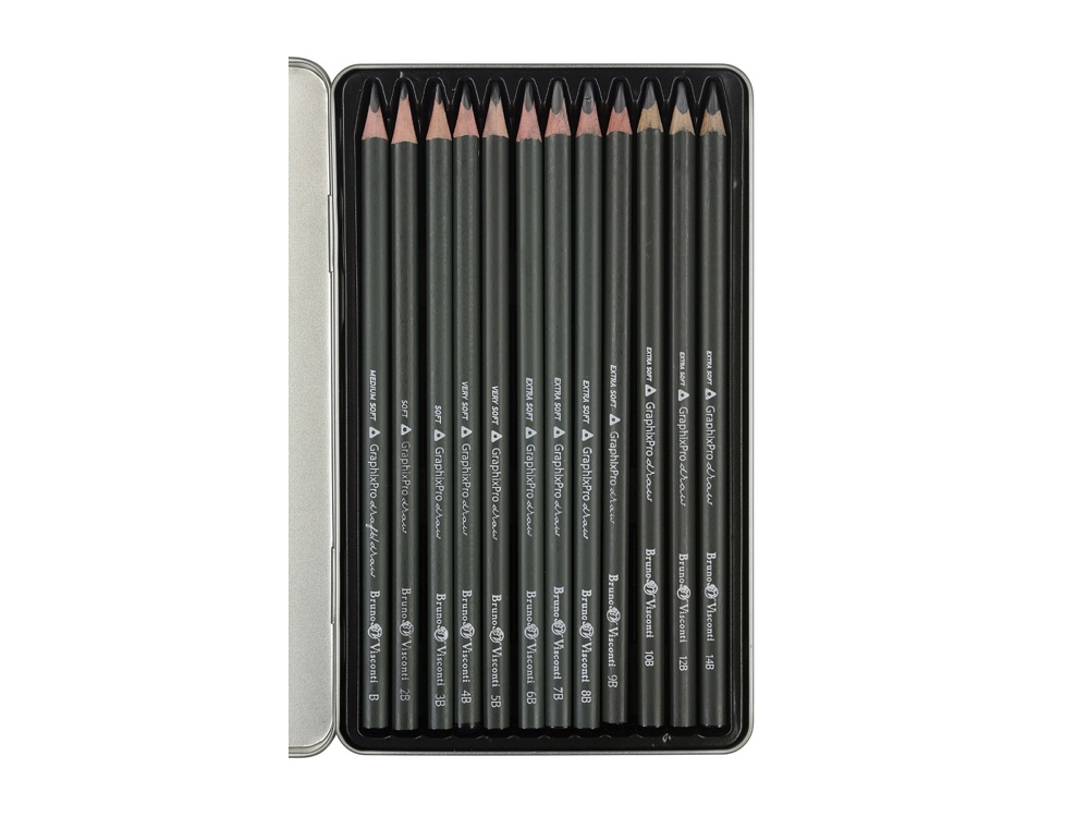 Комплектность 12 карандашей разной твердости (B, 2B, 3B, 4B, 5B, 6B, 7B, 8B, 9B, 10B, 12B, 14B), металлическая коробка