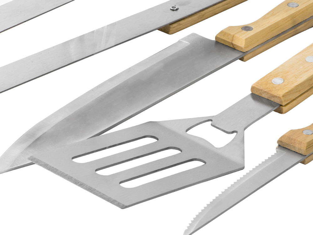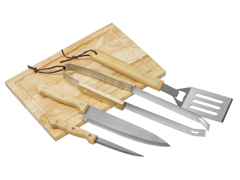 Набор из шести приспособлений для барбекю и гриля - в состав входят разделочная доска, щипцы, лопатка, нож для стейка, нож большой, а упаковывается сет в чехол из полиэстера. Благодаря длинным ручкам из каучукового дерева лопатку, ножи и щипцы удобно держать, не боясь горячих брызг при готовке. Деревянные ручки не нагреваются, что особенно ценно во время BBQ. - приспособления для всех этапов приготовления барбекю и гриля - деревянные длинные ручки не нагреваются и не скользят - нержавеющая сталь, каучуковое дерево - чехол для хранения из полиэстера
