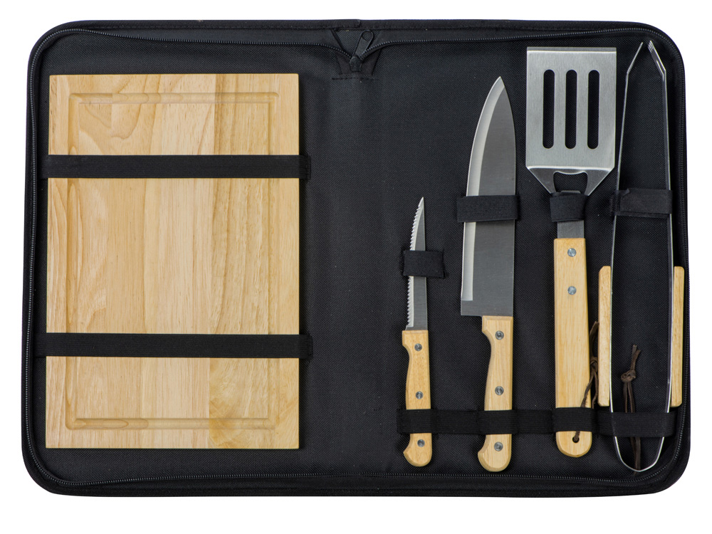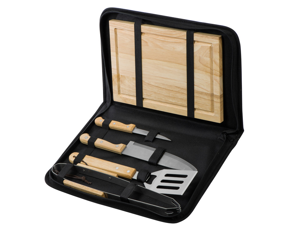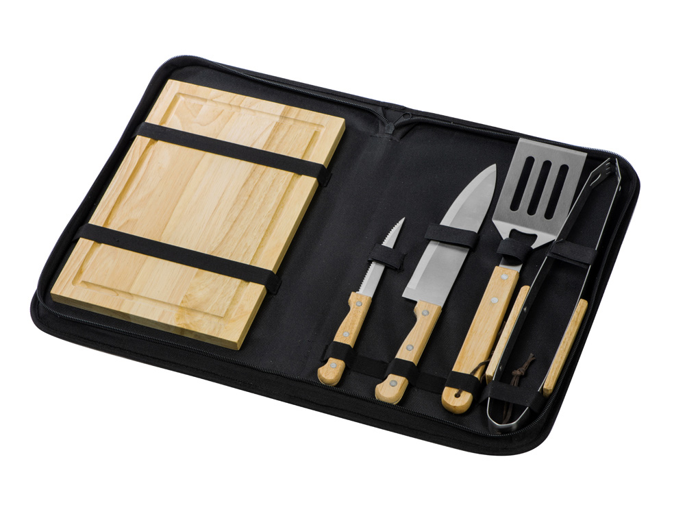 | Комплектность | разделочная доска 20 х 30 см, щипцы 34,5 см, лопатка 32,5 см, нож для стейка 21,5 см, нож большой 31,5 см, чехол из полиэстера 38,5 х 4,5 х 24,8 см |