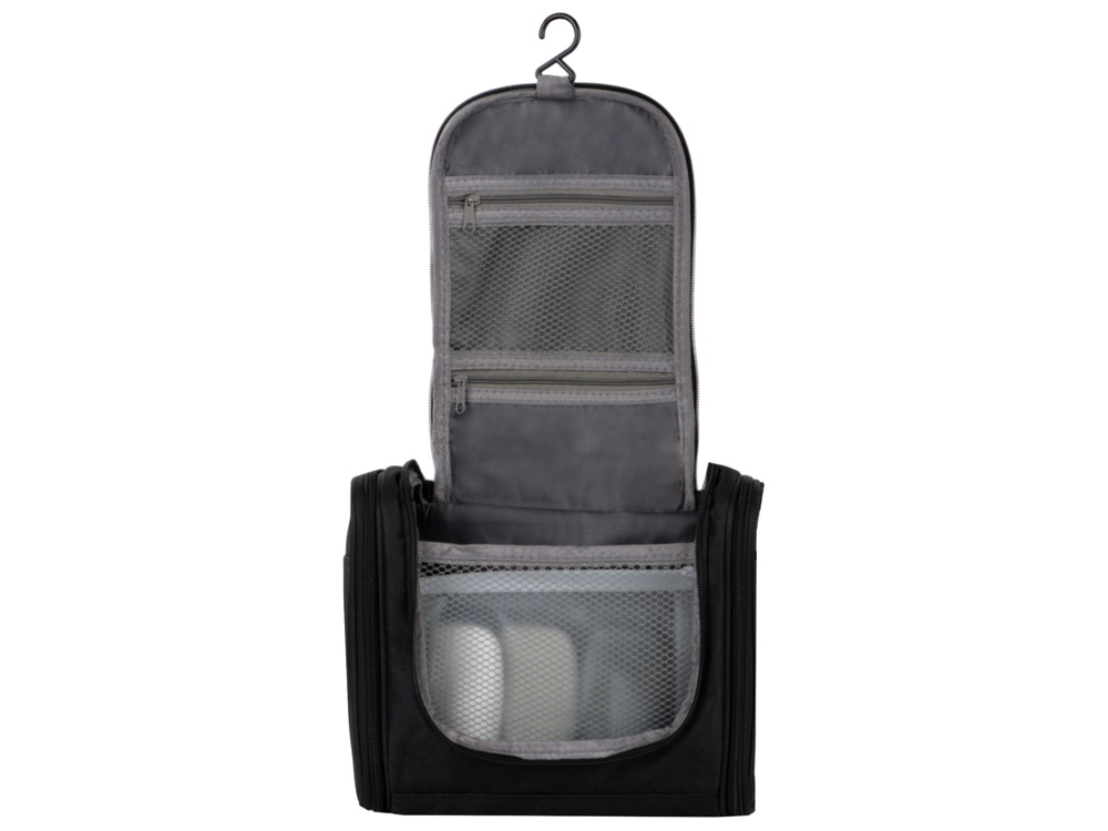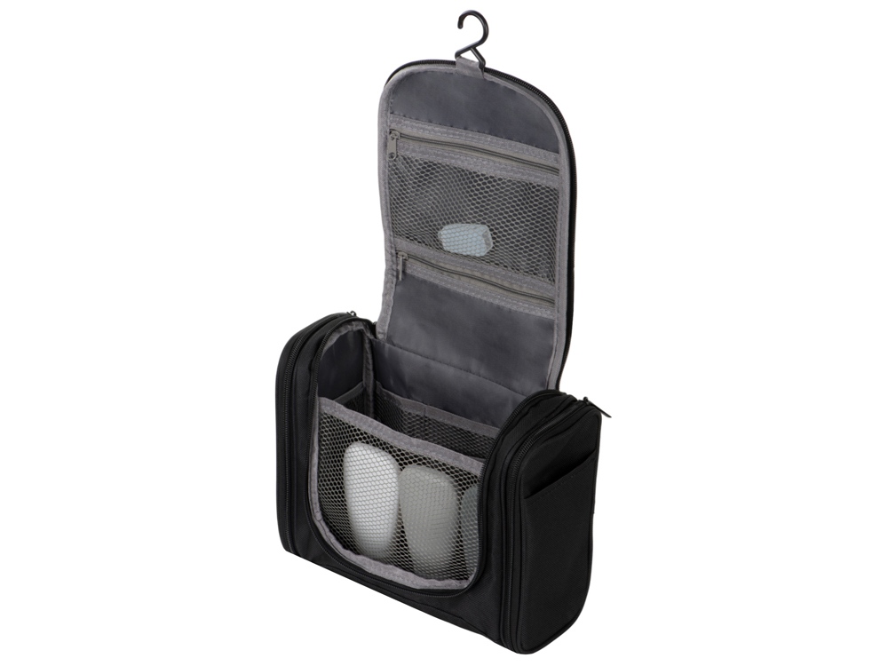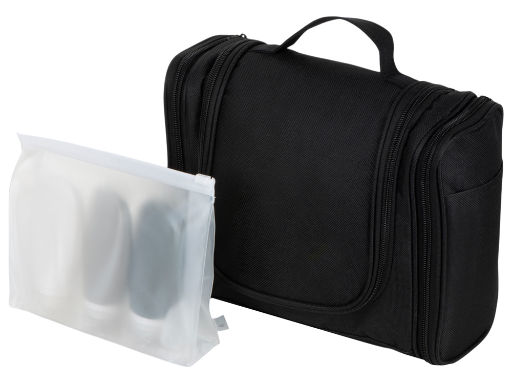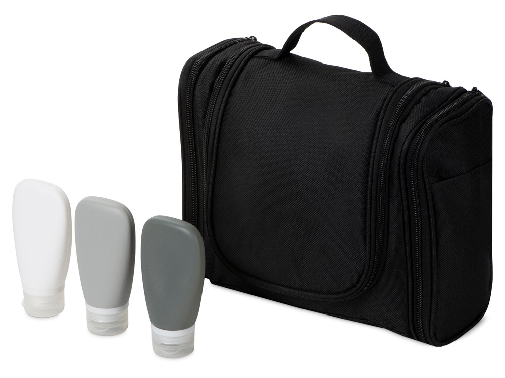 Набор On air состоит из двух предметов: Несессер для путешествий. Эргономичный и вместительный, имеет внутренние и внешние карманы и большое отделение внутри. Оснащён ручкой для переноски и крючком для подвешивания. Нейтральный лаконичный дизайн позволяет преподнести несессер как мужчине, так и женщине; Силиконовые ёмкости для косметических средств. Три флакончика по 90 мл каждый пригодятся для коротких поездок, а еще они вписываются в лимит большинства авиакомпаний по провозу жидкости в ручной клади. - силиконовые флакончики упакованы в полупрозрачную косметичку из EVA; - колпачок для зубной щётки в комплекте; - в несессере предусмотрены резинки и кармашки для мелких предметов, например, бритвенного станка.