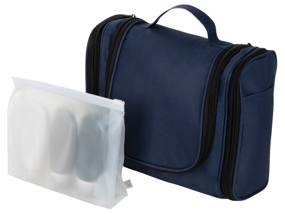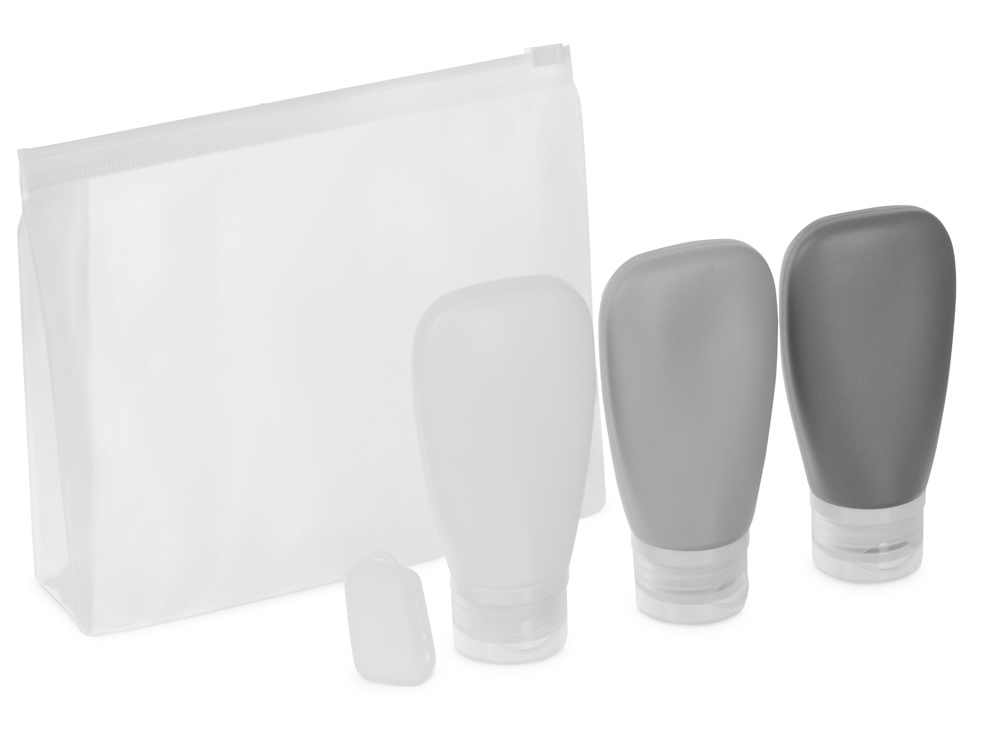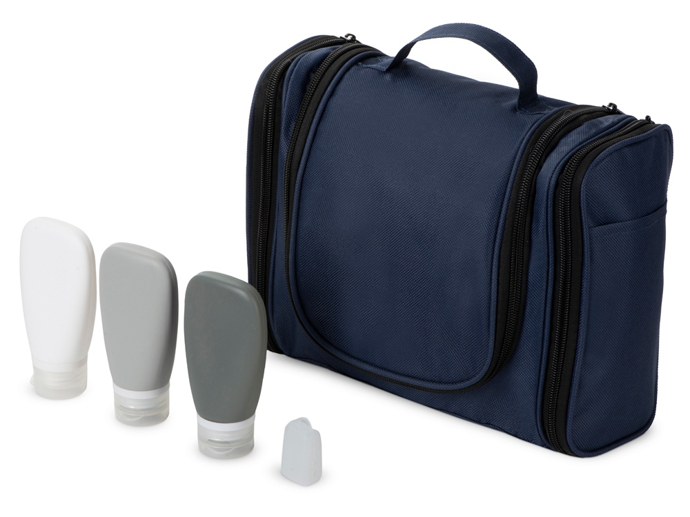 Набор On air состоит из двух предметов: Несессер для путешествий. Эргономичный и вместительный, имеет внутренние и внешние карманы и большое отделение внутри. Оснащён ручкой для переноски и крючком для подвешивания. Нейтральный лаконичный дизайн позволяет преподнести несессер как мужчине, так и женщине; Силиконовые ёмкости для косметических средств. Три флакончика по 90 мл каждый пригодятся для коротких поездок, а еще они вписываются в лимит большинства авиакомпаний по провозу жидкости в ручной клади. - силиконовые флакончики упакованы в полупрозрачную косметичку из EVA; - колпачок для зубной щётки в комплекте; - в несессере предусмотрены резинки и кармашки для мелких предметов, например, бритвенного станка.