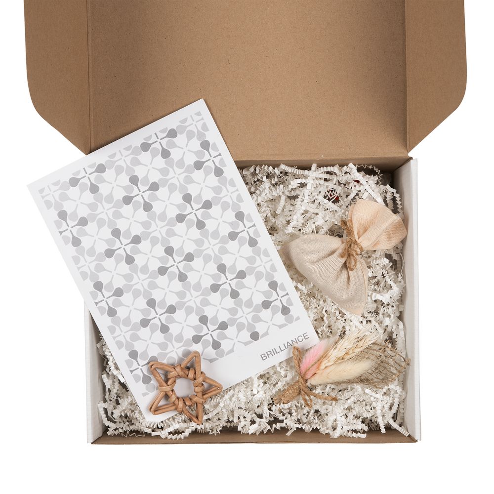 Коробка с наполнителем, шубером, открыткой и милыми украшениями Adorno — готовое решение для упаковки личного и корпоративного подарка.