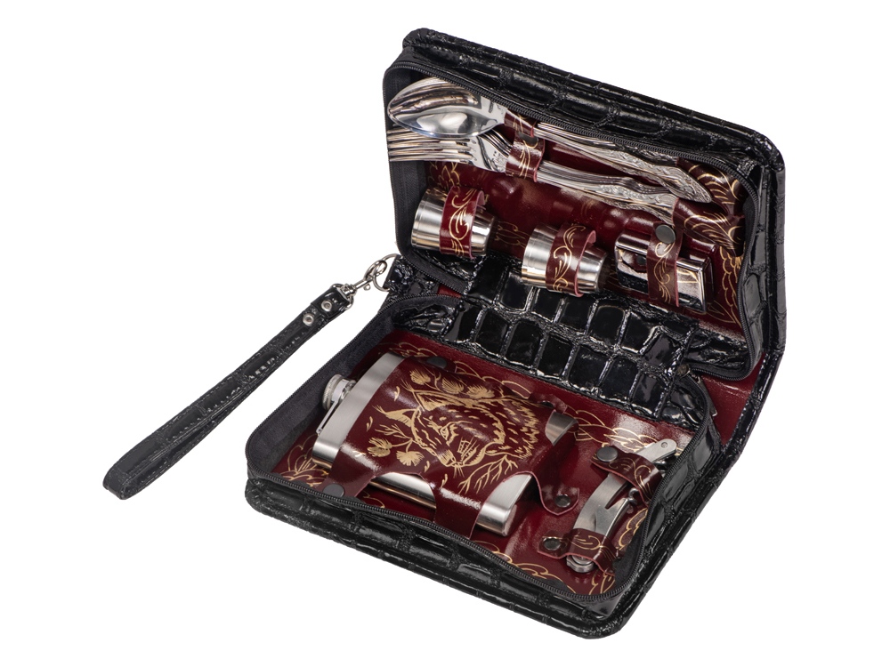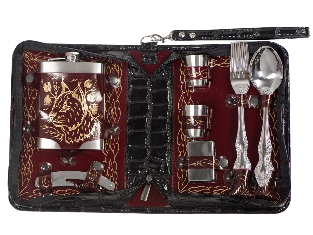 Оригинальный дорожный набор на 4 персоны в барсетке с удобным ремешком для переноски. Барсетка из искусственной кожи, отделка- натуральная кожа с художественным выжиганием. В набор входит: - фляжка 240 мл- 1 шт - стопка 30 мл- 4 шт - ложка столовая- 4 шт - вилка столовая- 4 шт - нож- 1шт - зажигалка- 1шт