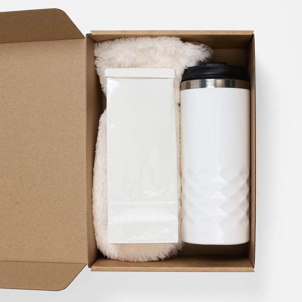 Материал термостакан, крышка - пластик; внутренняя стенка - нержавеющая сталь; варежки - полиэстер 100%, плотность 280 г/м², длинноворсовый флис; коробка - микрогофрокартон