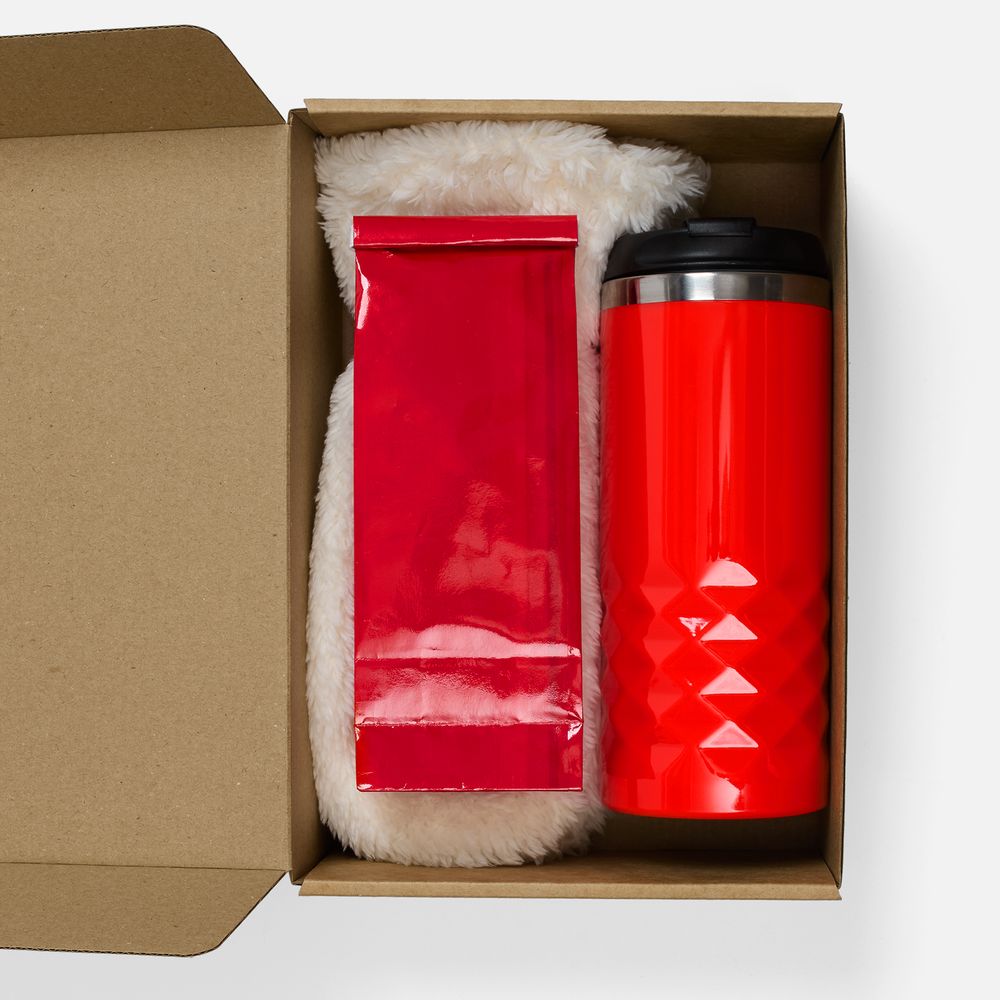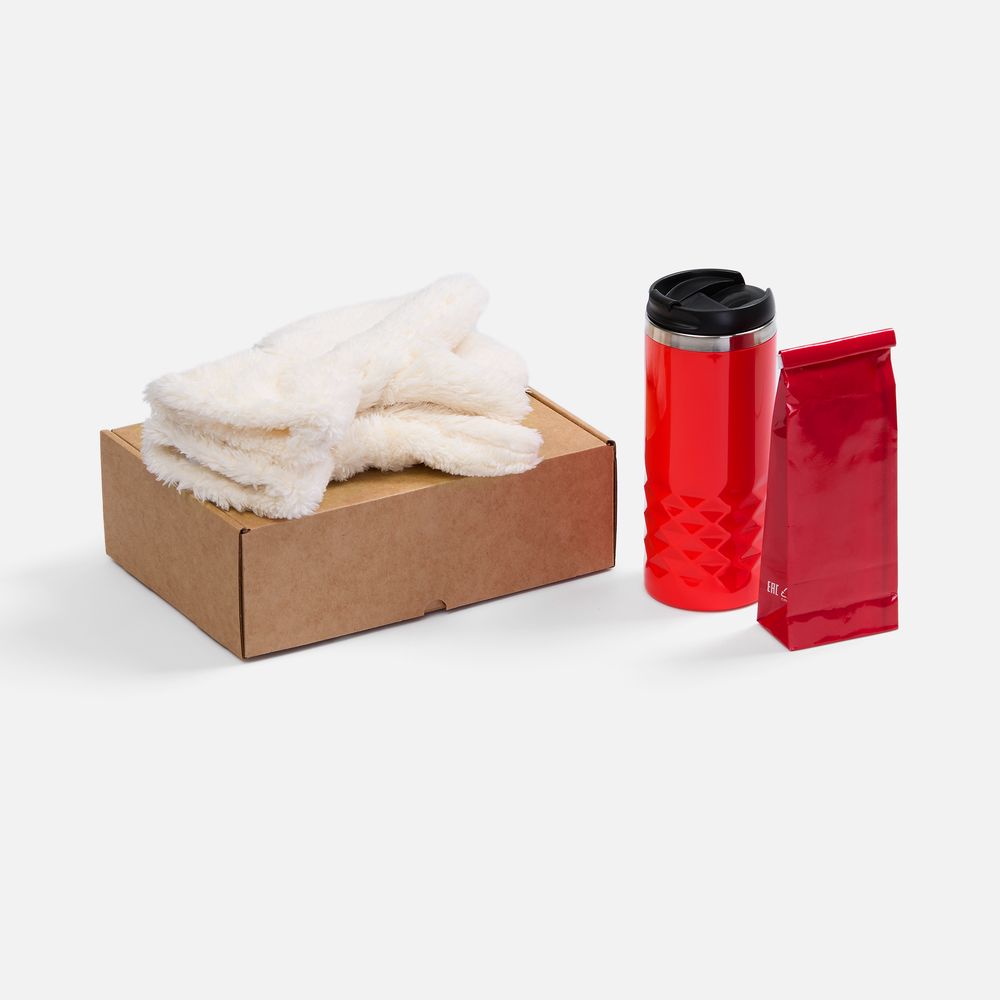 Материал термостакан, крышка - пластик; внутренняя стенка - нержавеющая сталь; варежки - полиэстер 100%, плотность 280 г/м², длинноворсовый флис; коробка - микрогофрокартон