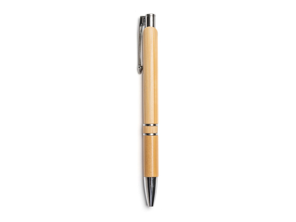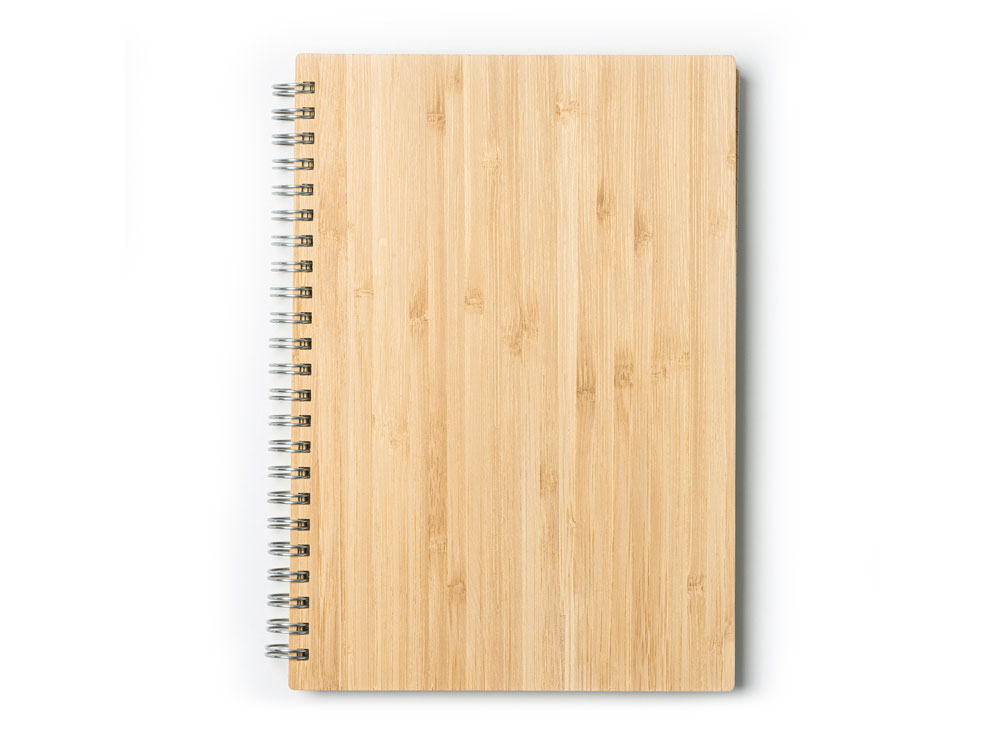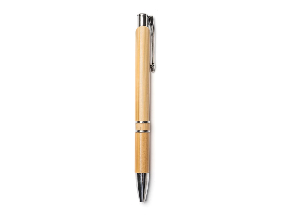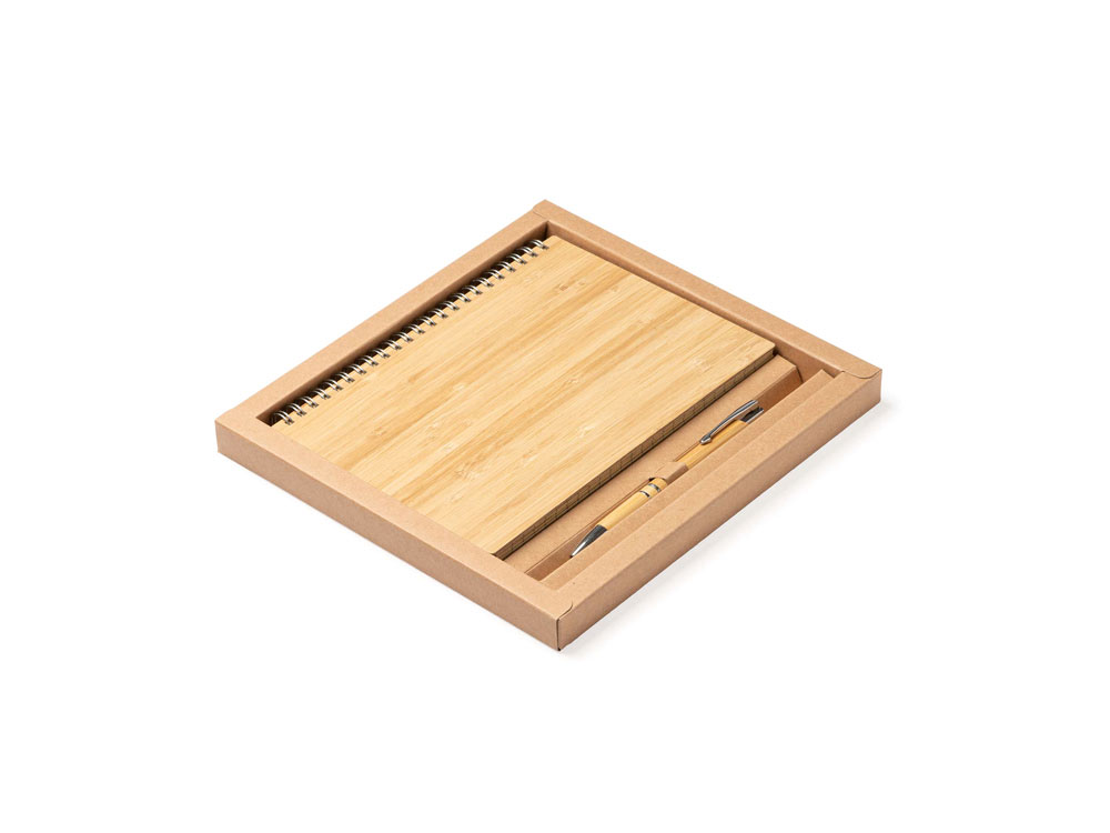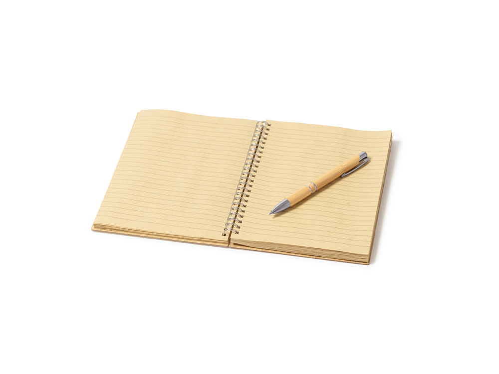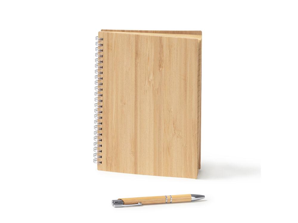 Блокнот и ручка из бамбука формата А5. Блокнот с твердой обложкой и 80 разлинованными листами из переработанной бумаги. Шариковая ручка с хромированными деталями и синими чернилами.