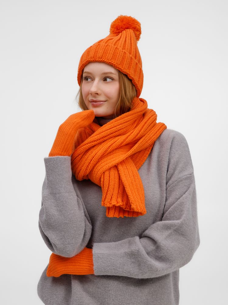 Шапка с пышным помпоном и отворотом, связанная крупной резинкой создает игривый силуэт, а широкий шарф с выразительной текстурой надежно защищает от ветра, сохраняя свободу движений. Варежки с отворотом-резинкой плотно облегают запястье, не пропуская холод.