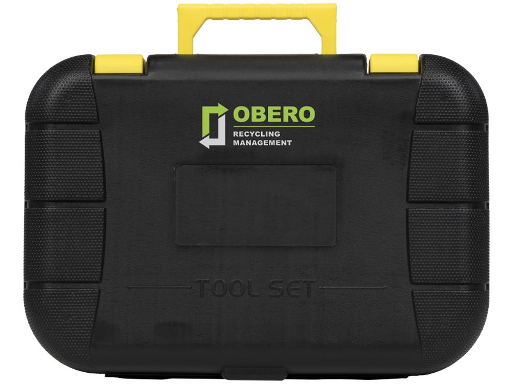 Инструментальный ящик с замком и складной ручкой, включающий молоток-гвоздодер, отвертку с плоским шлицем 4 мм, универсальные плоскогубцы, универсальный нож с фиксатором, 5 шестигранных ключей (2-6 мм) с держателем со стандартными и шаровыми наконечниками, измерительную рулетку длиной 3 м с фиксатором, индикаторную отвертку, изоляционную ленту и 4 прецизионных отвертки. Пластик ABS.