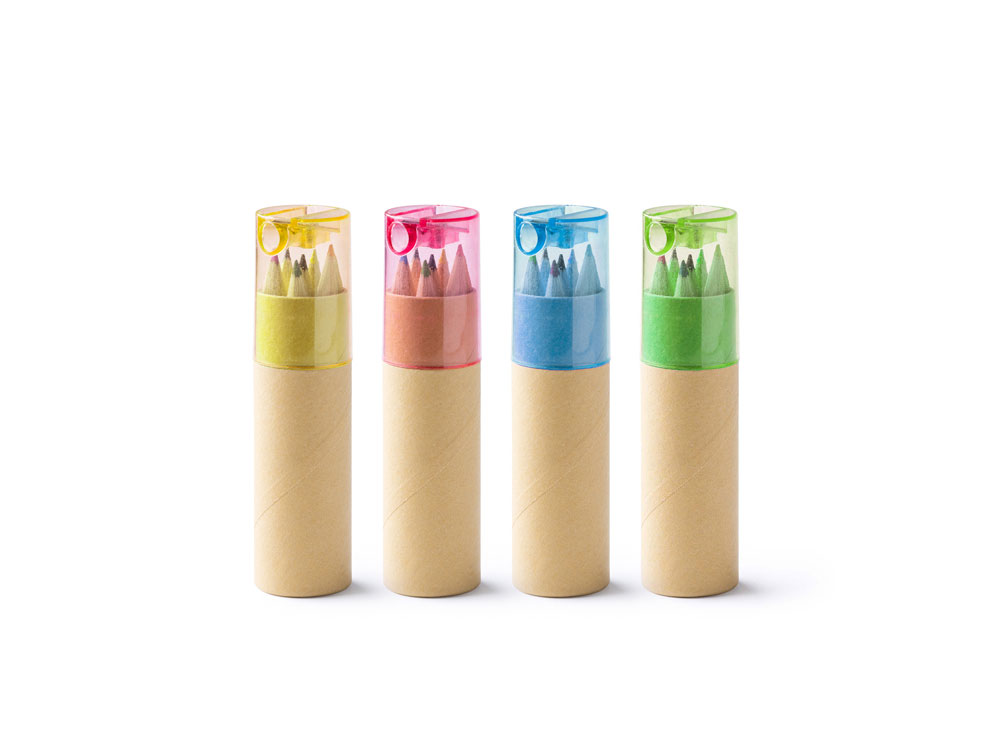Набор из 6 деревянных карандашей в футляре из переработанного картона с полупрозрачной цветной крышкой. В крышку встроена точилка для карандашей. Доступен в различных цветах.