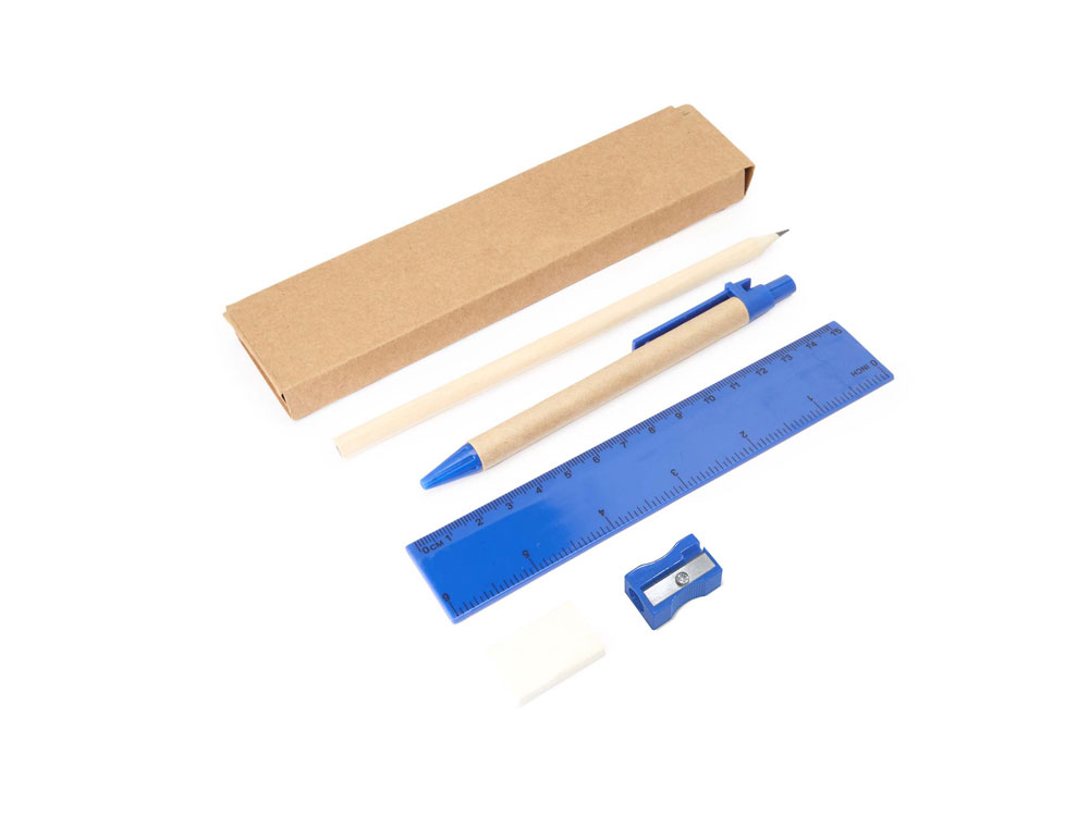 Канцелярский набор. Включает ручку с картонным корпусом и синими чернилами, деревянный карандаш, точилку для карандашей, ластик и линейку длиной 15 см.