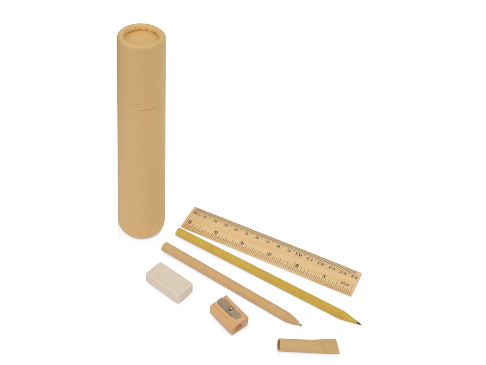 Универсальный набор канцелярских мелочей, который подойдет как для офиса, так и для дома. Удобно хранить или брать с собой благодаря упаковке в виде тубуса. В состав набора входят: - Шариковая ручка; - Карандаш; - Линейка; - Ластик; - Точилка.