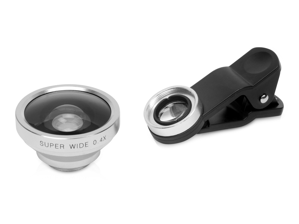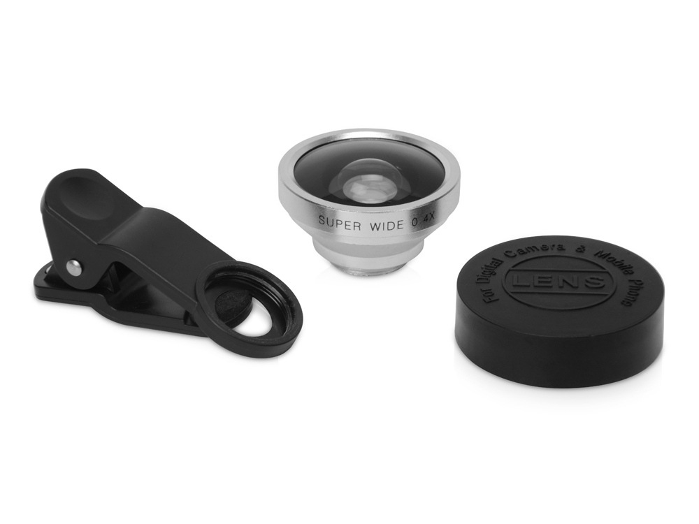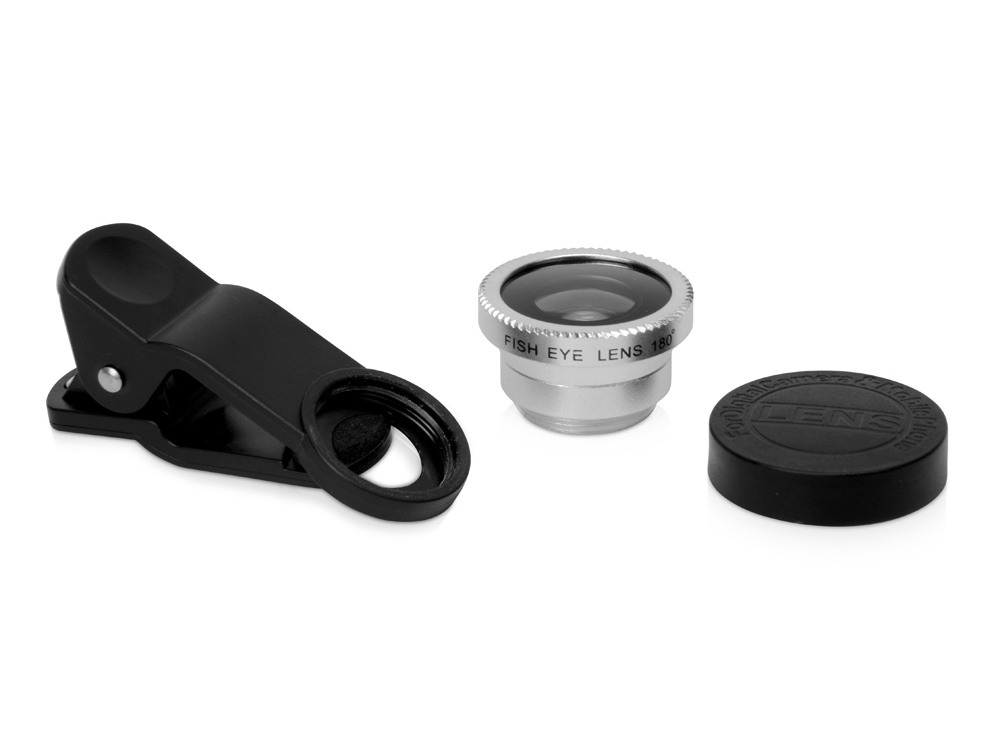 Универсальный набор из 3 линз (объективов) для смартфона. Подходит как для внешних, так и для камер селфи. В наборе: широкоугольный объектив (0,4 х), объектив рыбий глаз (180°) разбирается на 2 части, одна из них - объектив для макросъёмки, зажим-прищепка для крепления объективов, инструкция, пластиковый бокс, защитные крышки для объективов, мягкий чехол.