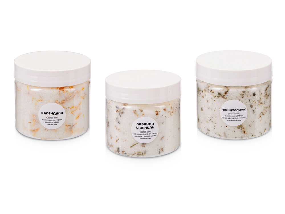 | Комплектность | соль для ванны календула в банке, соль для ванны лаванда-ваниль в банке, соль для ванны можжевельник в банке, упаковочный материал |