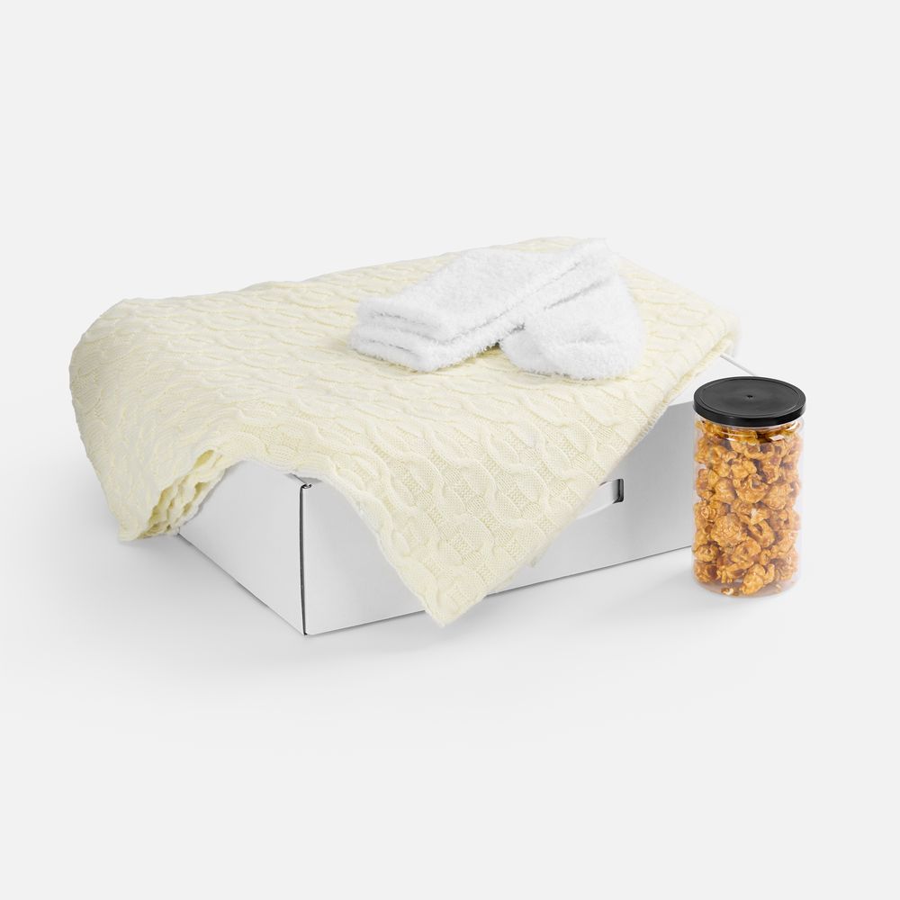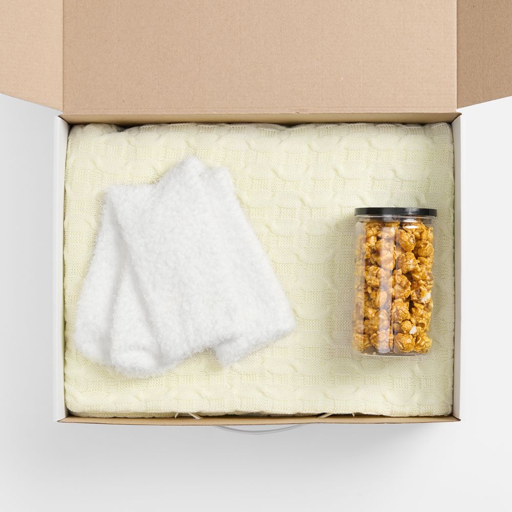 | Материал | коробка - микрогофрокартон, пластик; плед - акрил 100%; упаковка попкорна - пластик; носки - полиэстер 100% |