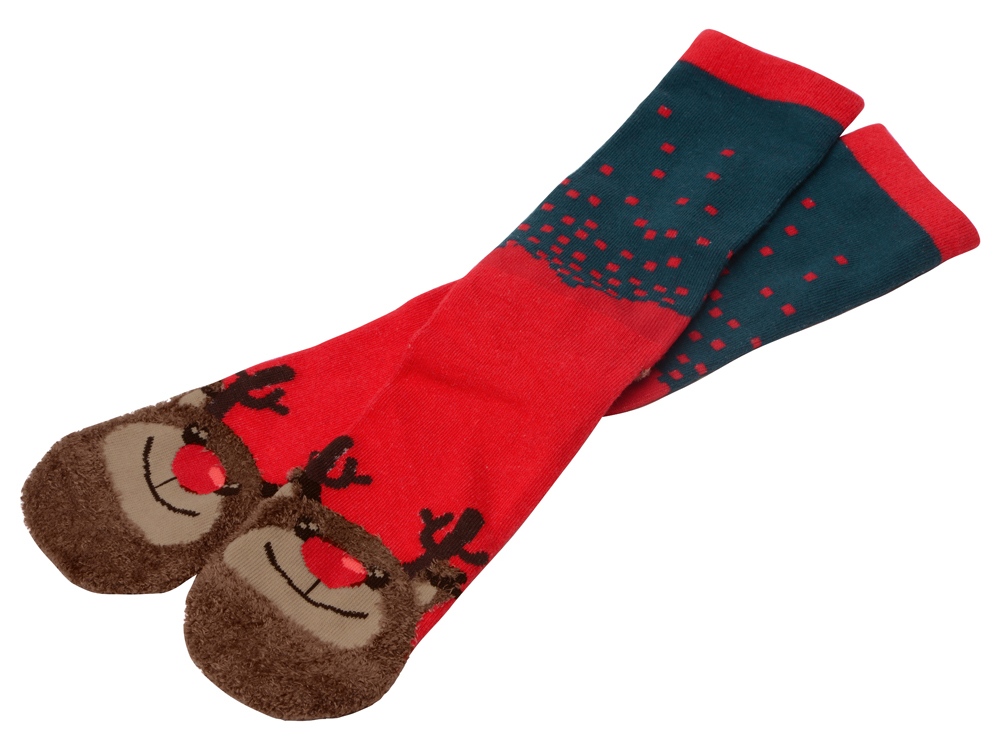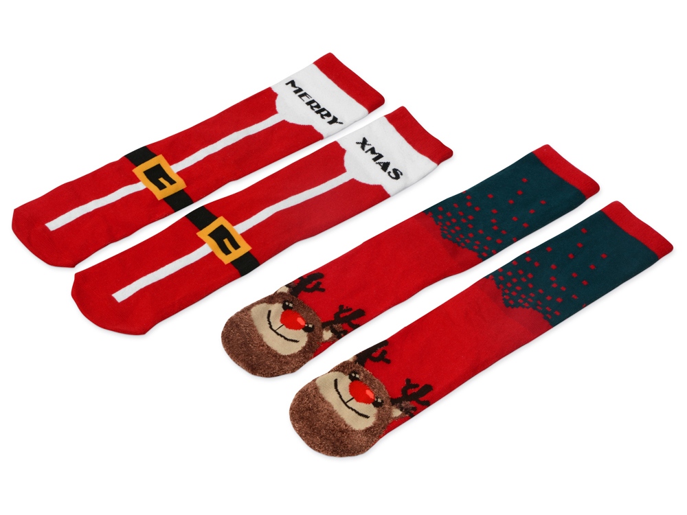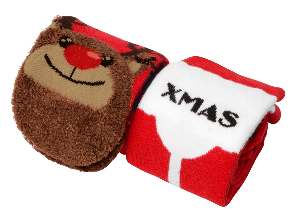 Рождественские носки прекрасно подойдут на роль подарка, который создает праздничное настроение. Этот набор состоит из двух пар, которые упакованы в мешочек из натурального хлопка. Одна пара украшена мягкими пушистыми мордочками рождественских оленей, а принт на второй изображает сапожки Санта Клауса. Ткань - смесь хлопка, полиэстера и спандекса, что обеспечивает носкам износостойкость, а мягкая широкая резинка – удобную посадку по ноге. Мешочек-упаковку можно брендировать по вашему желанию. Размер носков 40-43.