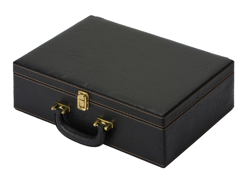 Кейс из сплит-кожи, с повышенной износостойкостью, внутренняя отделка натуральная кожа. В комплекте: Фляга 240 мл (нерж.сталь)– 1шт. Стопка 40 мл (нейзильбер)– 4 шт. Зажигалка зиппо– 1 шт. Нож Универсал (нерж. сталь) 45Х13, рукоять орех, бронзовое литье– 1 шт. Тарелка из нейзильбера– 4 шт.