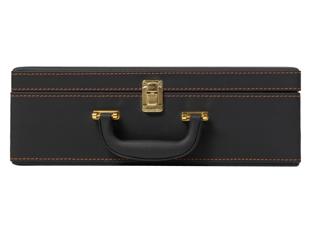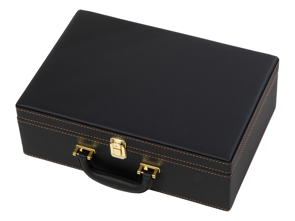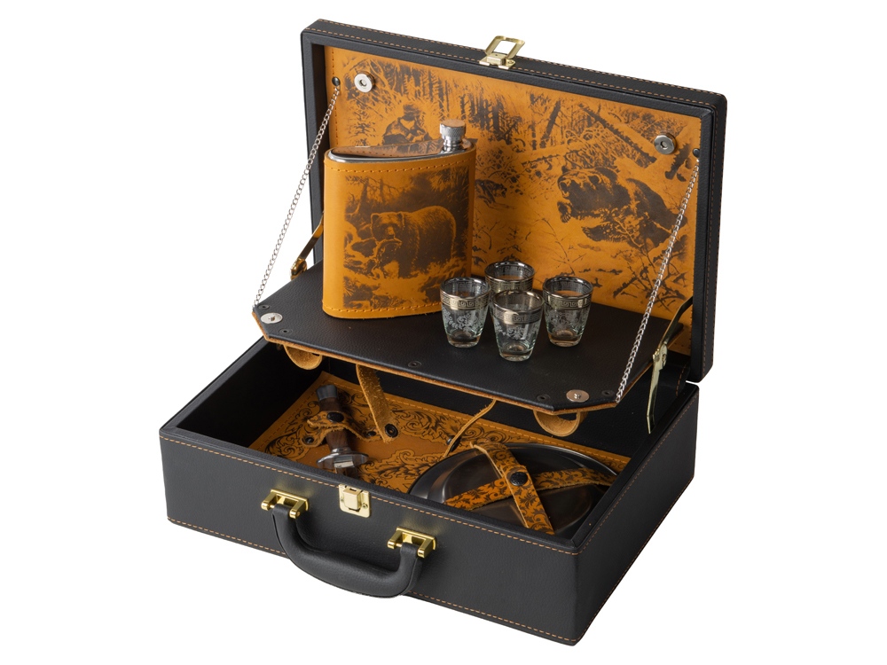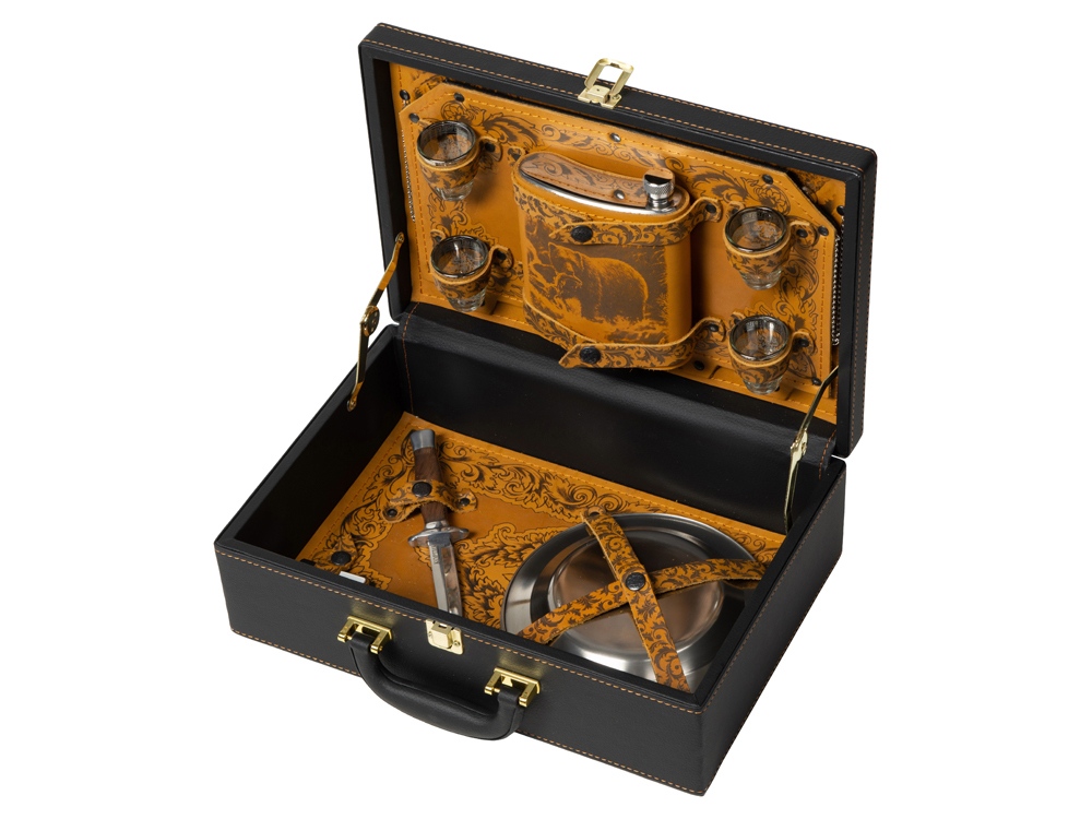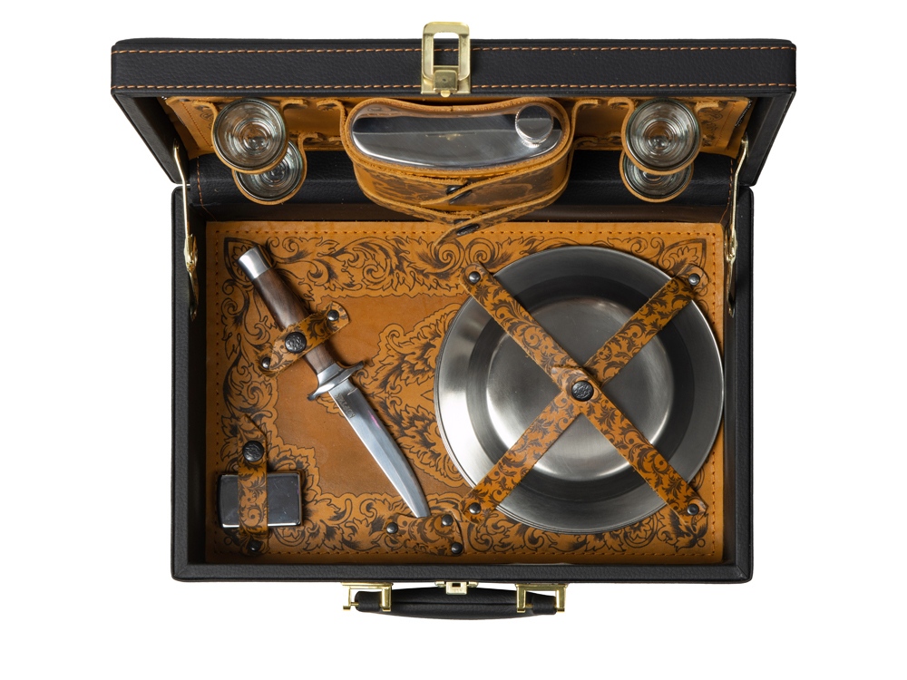 Кейс из сплит-кожи, с повышенной износостойкостью, внутренняя отделка натуральная кожа. В комплекте: Фляга 580 мл (нерж.сталь) – 1шт. Стопка 40 мл (стекло) – 4 шт. Зажигалка – 1 шт. Нож (нерж. сталь) – 1 шт. Тарелка – 4 шт.