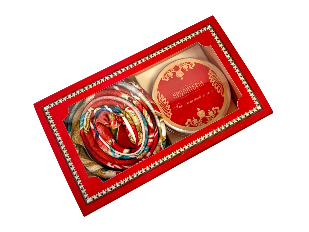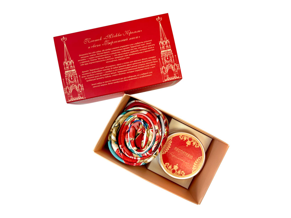 Город Москва – символ триумфа и победоносных свершений. Платок Кремль – Москва в шелке воплощает шедевр ювелирного искусства Карла Фаберже из серии подарков для русской императорской семьи. В центре полотна расположен Успенский собор в обрамлении башен Московского Кремля. Утонченный рисунок, яркое цветовое решение и глубокий символизм дизайна платка созданы для эффектного акцента праздничного образа. Свеча Бархатный пион наполнит пространство насыщенным ароматом цветов пиона, розы, жасмина и сочного красного яблока. Дуэт создаст торжественную атмосферу праздника, где все мечты и желания непременно исполнятся! Платок: 70% искусственный шёлк, 30% вискоза, 90х 90 см Свеча: натуральный соевый воск, парфюмерная композиция (объем 100мл/ 20 часов горения)