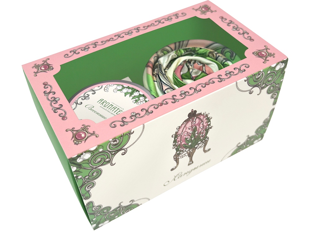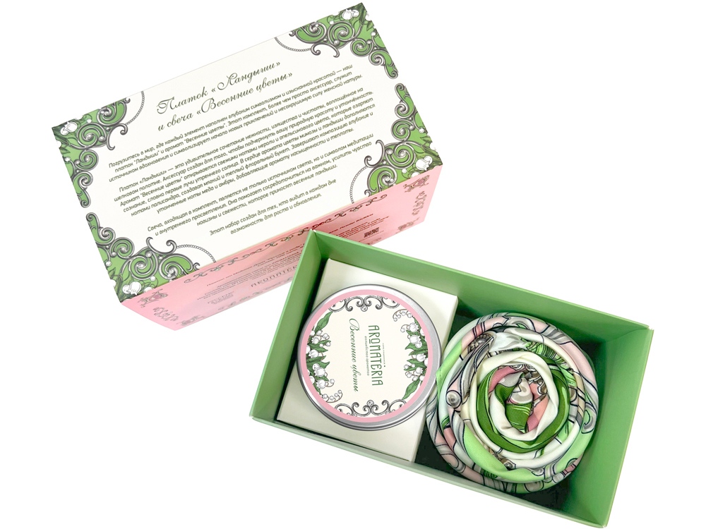 Весна – время расцвета, преисполненного нежностью чувств. Окутайте себя тонкой дымкой шелка изящного платка Ландыши из серии Фаберже. С любовью и трепетом мы постарались передать филигранность и роскошь шедевра ювелирного искусства, взятого за основу композиции, – подарка Николая II императрице Александре Федоровне на Пасху 1898 года. Аромат свечи Весенние цветы открывается свежими нотами апельсинового цвета, мимозы и ландыша, завершая флоральный букет аккордами меда и амбры. Дуэт станет знаковым подарком для самых дорогих сердцу близких! Платок: 70% искусственный шёлк, 30% вискоза, 90х 90 см Свеча: натуральный соевый воск, парфюмерная композиция (объем 100мл/ 20 часов горения)
