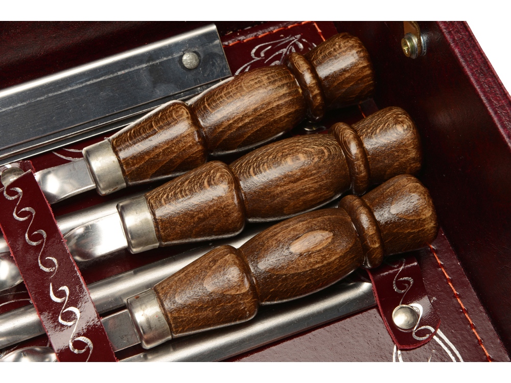Кейс из сплит-кожи, с повышенной износостойкостью, внутренняя отделка натуральная кожа с художественным выжиганием. В комплект входит: Стопка d5,5 х 6 см - 6шт Термос d7 х 25 см - 1шт Вилка 19,5 х 2,5 х 2 см - 6шт Ложка 19,5 х 4,5 х 2,5 см - 6шт Вилка для барбекю 23 х 3 х 3см - 1шт Нож 26,5 х 4 х 2,5 см - 1шт Ножки для мангала 51 х 31 х 1 см - 2шт Шампур d3 х 65,5 см - 6шт Штопор 11 х 3 х 1см - 1шт Нож Проводник 47 х 8 х 3 см - 1шт