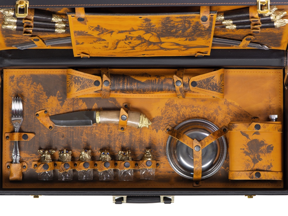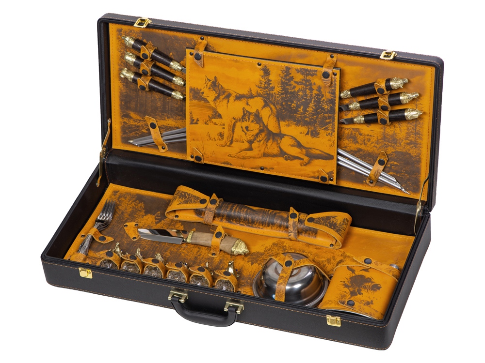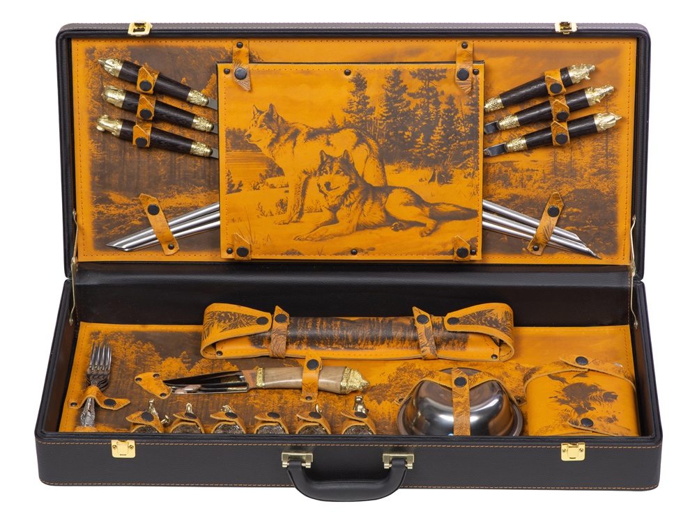 Кейс из сплит-кожи, с повышенной износостойкостью, внутренняя отделка натуральная кожа с художественным выжиганием. В комплект входит: - шампура большие d2,7 х 66 см - 6 шт - шампура мленькие 34,5 х 1 х 1,9 см- 6 шт - доска разделочная 29,5 х 20 см - вилка 19 х 2,5 х 1,8 см- 6 шт - нож 23 х 2,8 х 2,5 см - стопка 30 мл- 6 шт - тарелка d15 х 5 см- 6 шт - фляга 12,4 х 4 х 16 см - мангал 24,5 х 34,7 х 16,7 см