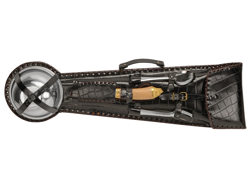 Набор для пикника в кожаном чехле ручной работы. В комплект входит: Тарелка 500 мл d16 х 7 см - 6шт Стопка d5,2 х 6 см - 6шт Нож 28,5 х 4 х 2,5 см - 1шт Ложка 19,3 х 4,5 х 3 см - 6шт Вилка 19,3 х 2,5 х 2 см - 6шт Топор 39,5 х 14,5 х 3,2 см - 1шт Ножки для мангала 50,5 х 31 х 1 см - 2шт Шампур 68 х 4 х 2,5 см - 6шт