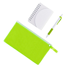 Маленький и легкий блокнот на 60 листов белой плотной бумаги легко поместится в сумке или кармане, и всегда будет под рукой. Блок скреплён металлической спиралью. Яркий гибкий пенал из ПВХ закрывается на zip-замок. Такой пенал удобно носить с собой и, благодаря тонким стенкам, он не занимает много места. На этот пенал можно нанести название компании и вложить в него несколько сувениров небольшого размера. Стильная пластиковая ручка имеет яркий резиновый грип, сочетающийся с цветом необычного изогнутого клипа. Удобно лежит в руке и не скользит в пальцах, поэтому сможет обеспечить комфортное и долгое письмо. - формат блокнота: А7; - петелька на пенале для подвешивания или для брелока; - ручка с нажимным механизмом; - цвет чернил: синий.