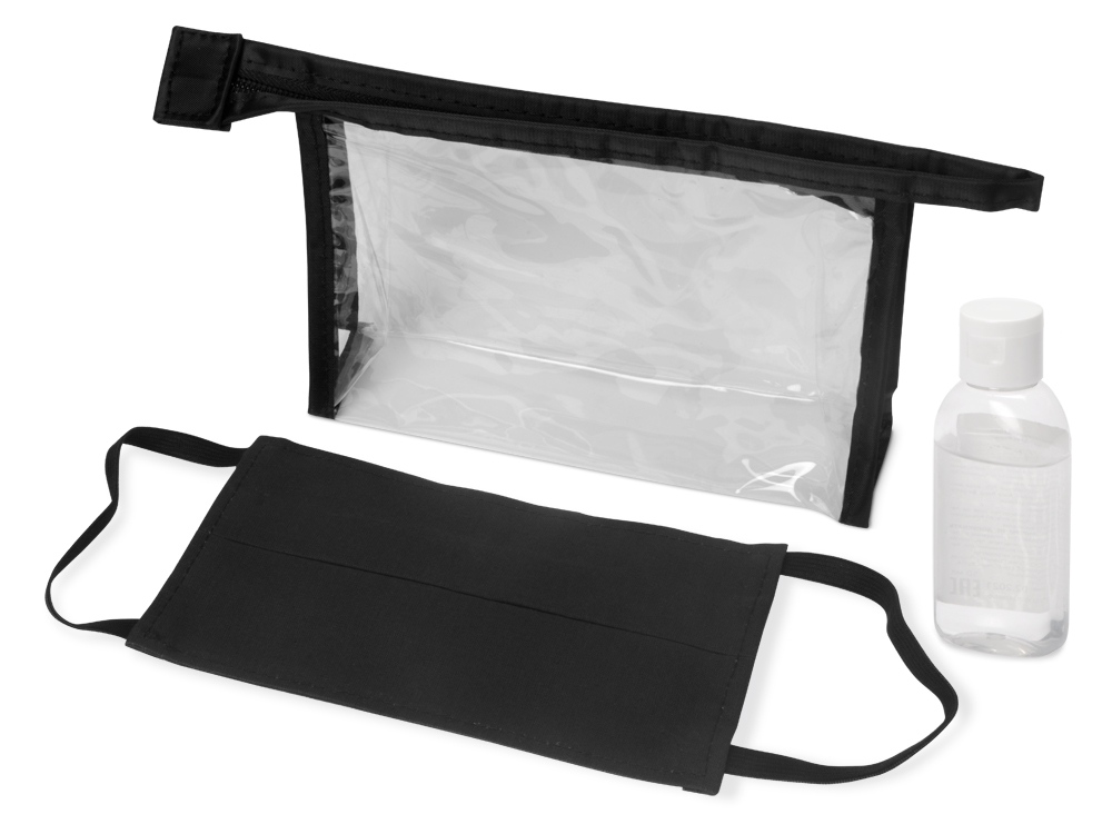 Самое необходимое всегда под рукой - в любом месте и при любой ситуации. Многоразовая хлопковая маска черного цвета и антисептик в стильной пластиковой косметичке поместятся в любой сумке.