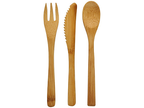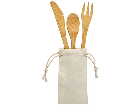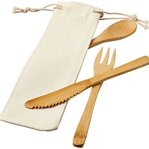Набор столовых приборов Celuk из бамбука. Набор столовых приборов из бамбука состоит из вилки, ножа и ложки. Поставляется в нетканом мешочке. Бамбук.