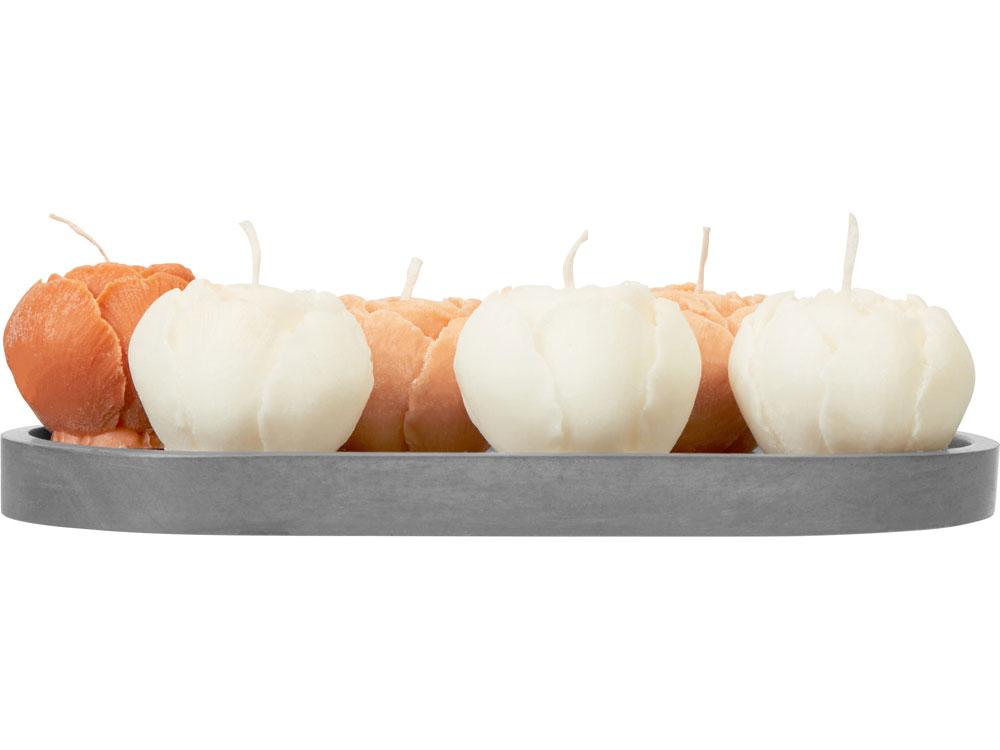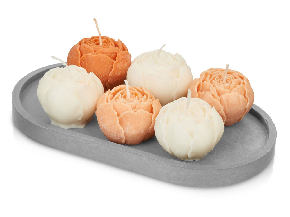 Набор из шести ароматических свечей в форме пионов поможет наполнить ваш дом нежностью и уютом. Природный дизайн в сочетании с графитово-серой подставкой из гипсобетона подойдет к любому интерьеру. В наборе три белых свечи со сладким ароматом французской ванили, две персиковых с согревающими и укутывающими нотками перца, нероли и амбры и одна темно-персиковая, обладающая свежим и успокаивающим запахом лаванды. Это позволяет выбрать аромат под настроение. Свечи на 80% изготовлены из натуральных соевого и кокосового воска, не токсичны при горении и не вредны для дыхания. После того как свечи прогорят, подставку можно использовать для пало санто или других благовоний, а также для хранения различных мелочей или ювелирных украшений. - Элегантный дизайн - Многофункциональная подставка из гипсобетона - Экосостав - Ручная работа