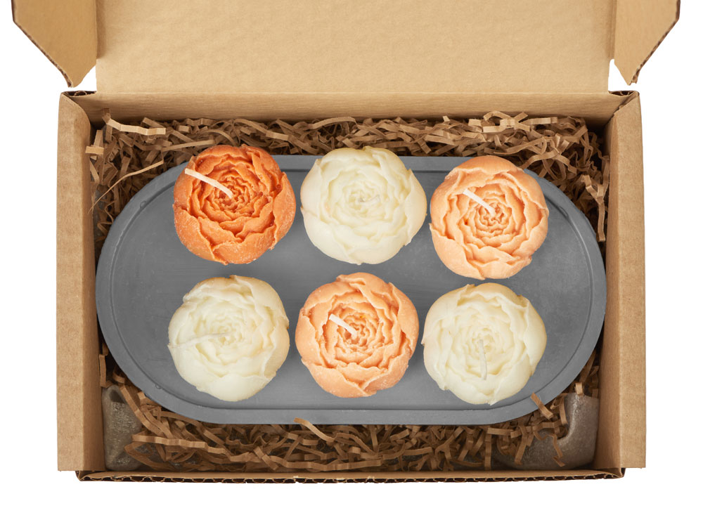 | Комплектность | три белых свечи пион, одна темно-персиковая свеча пион, две персиковые свечи пион, подставка гипсобетон, упаковочный материал |
