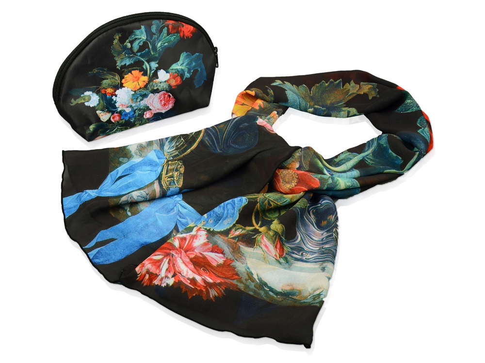 Изысканный подарочный набор для стильной женщины. Косметичка и шарф с цветочным принтом, выполненные в едином стиле, станут отличным дополнением к образу. Настоящий вкус проявляется в деталях.