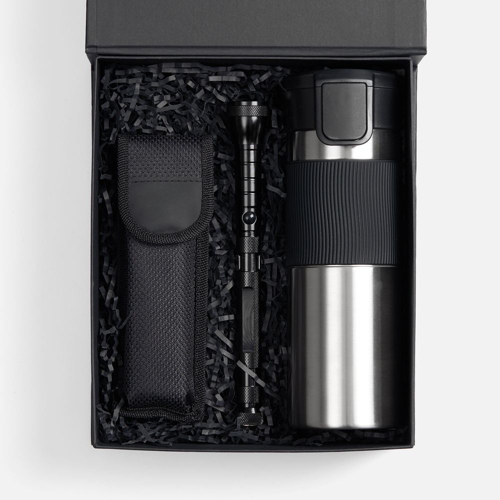 Компактный мультитул, гибкий фонарь и большой герметичный термостакан — все, что нужно для ремонта, строительства или работы в гараже. Емкость термостакана 450 мл.