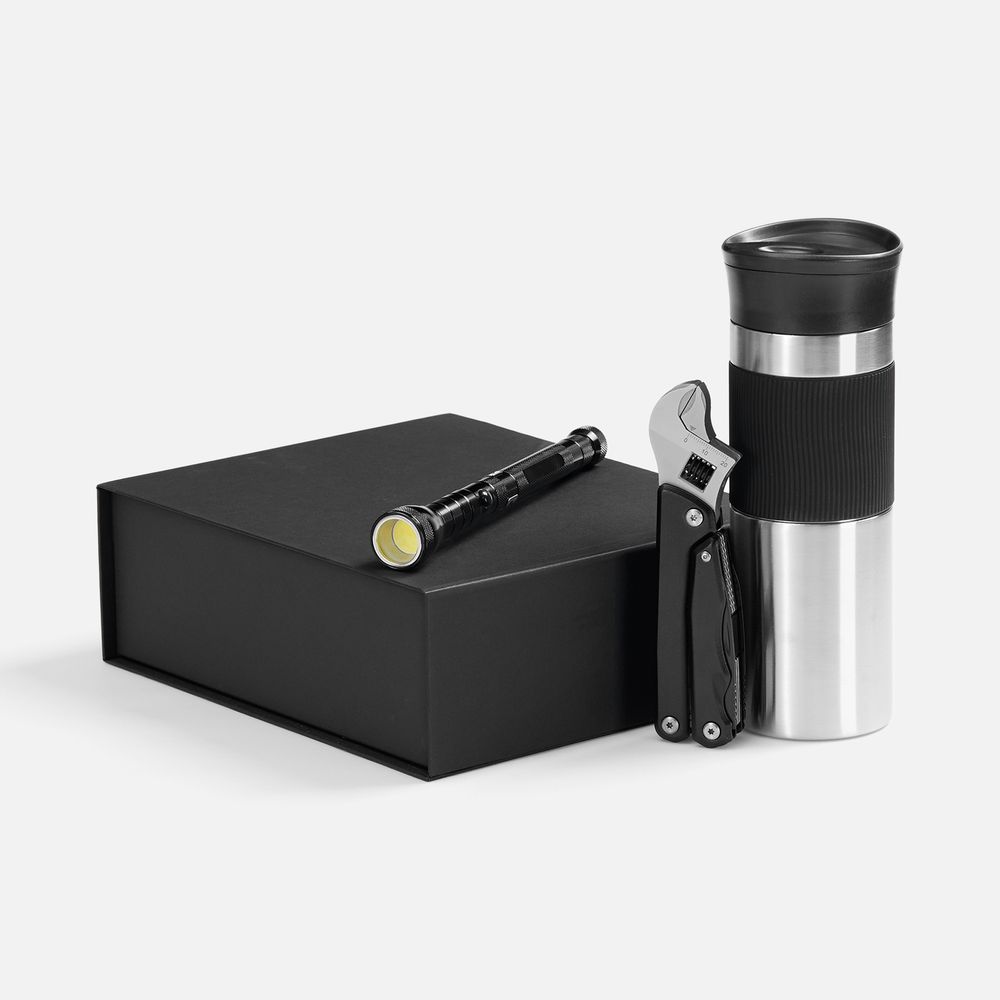 Материал мультитул - нержавеющая сталь; алюминий; термостакан - нержавеющая сталь; фонарь - алюминий, металл; коробка - переплетный картон, бумага Malmero