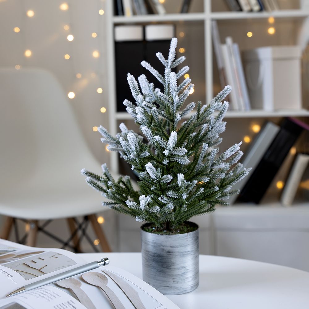 Подставка создает ощущение, что в дом занесли настоящее растение в горшке, а веточки, словно покрытые снегом, добавляют особой атмосферности и праздничности. С литыми иголками хвоя выглядит натуральнее, а силуэт елочки — живее и реалистичнее.