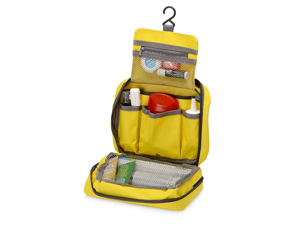 Несессер для путешествий – неотъемлемый атрибут комфортных поездок, служащий для компактного хранения различных мелочей. Аксессуар также пригодится для походов в спортзал и просто поддержания порядка дома. Это превосходный подарок любителю путешествий, а также отличный вариант промо-презента для рекламных кампаний. Большая поверхность позволяет нанести логотип или слоган фирмы. • Вместительное пространство с двумя большими отделениями и несколькими карманами дает возможность эргономично распределить весь дорожный арсенал косметических и туалетных принадлежностей. • Крючок позволяет подвесить аксессуар, например, в уборной поезда или гостиничном номере, в случае отсутствия полки. • Оптимальные размеры, не превышающие формат А4, позволяют легко разместить несессер в любом чемодане или дорожной сумке.